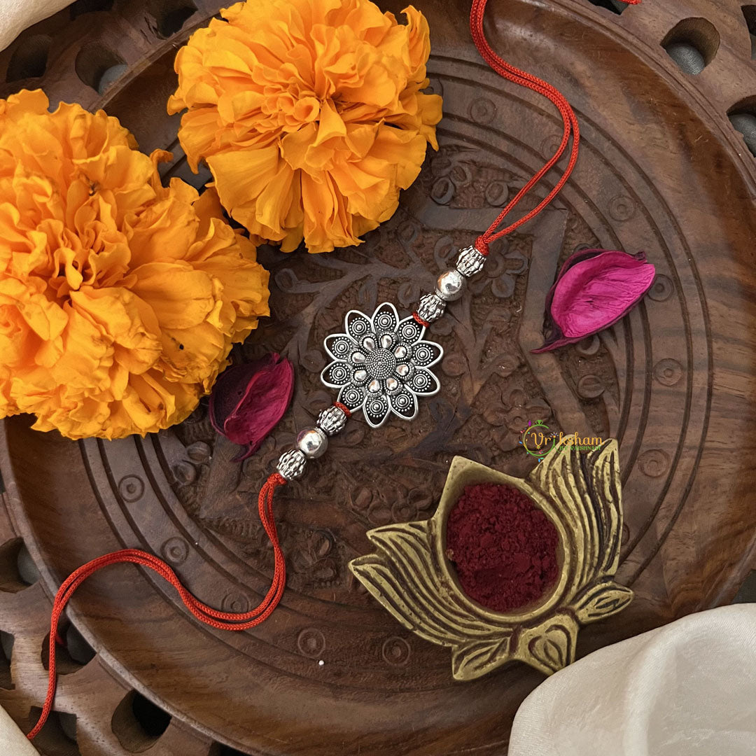 The Vriksham Rakshabandhan Oxidized Silver Lotus Flower Rakhi showcases a delicate lotus design crafted in oxidized silver, blending traditional symbolism with refined artistry. This sophisticated rakhi embodies purity and strength, making it a meaningful and elegant tribute to the cherished bond between siblings. Its timeless appeal ensures it will be treasured for years to come.