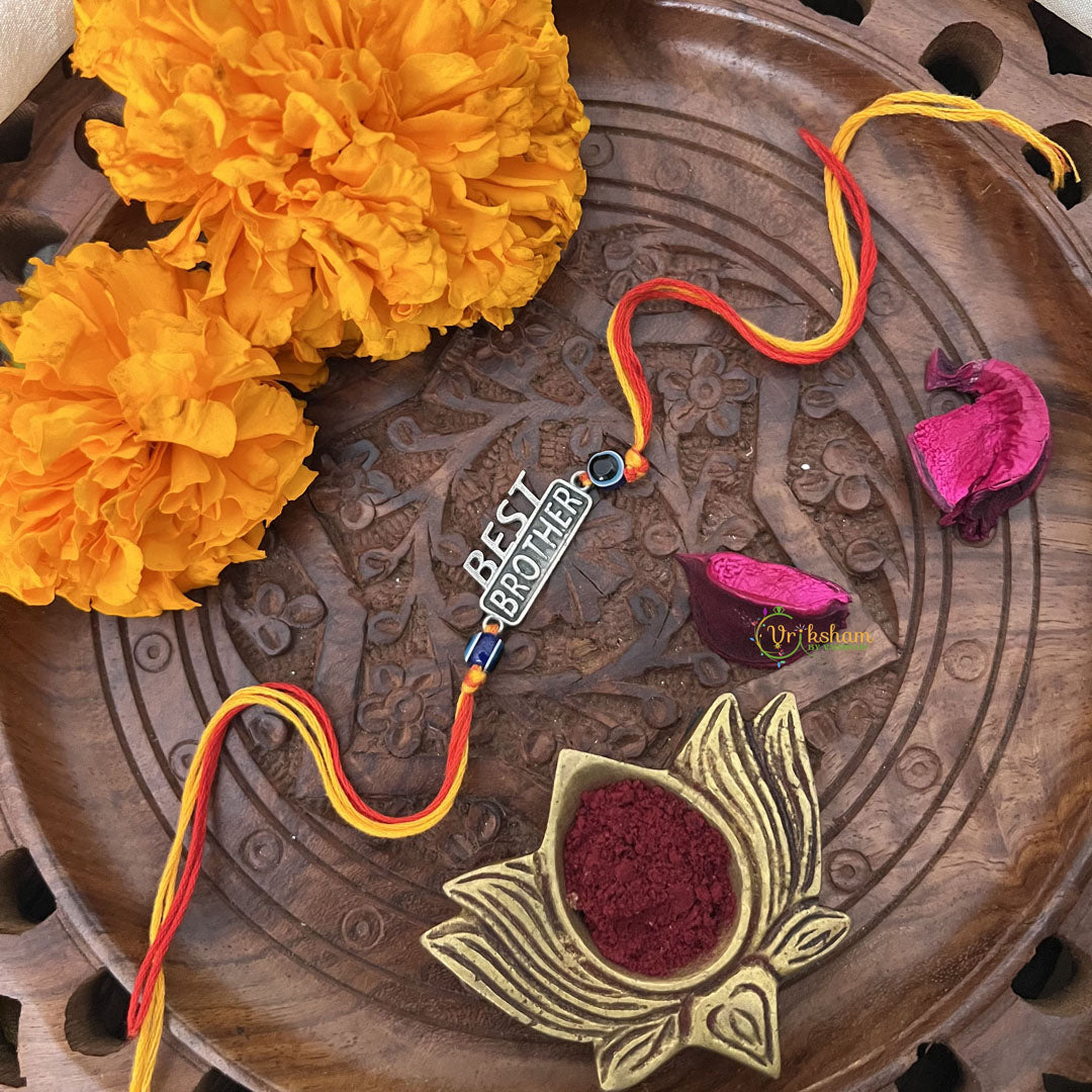 Celebrate the special bond with the Vriksham Rakshabandhan Silver Plated Best Brother Rakhi, featuring a sleek silver finish and a protective side evil eye bead. This sophisticated design not only adds elegance but also symbolizes safeguarding your brother from negative energies, making it a meaningful and stylish gift for Rakshabandhan.