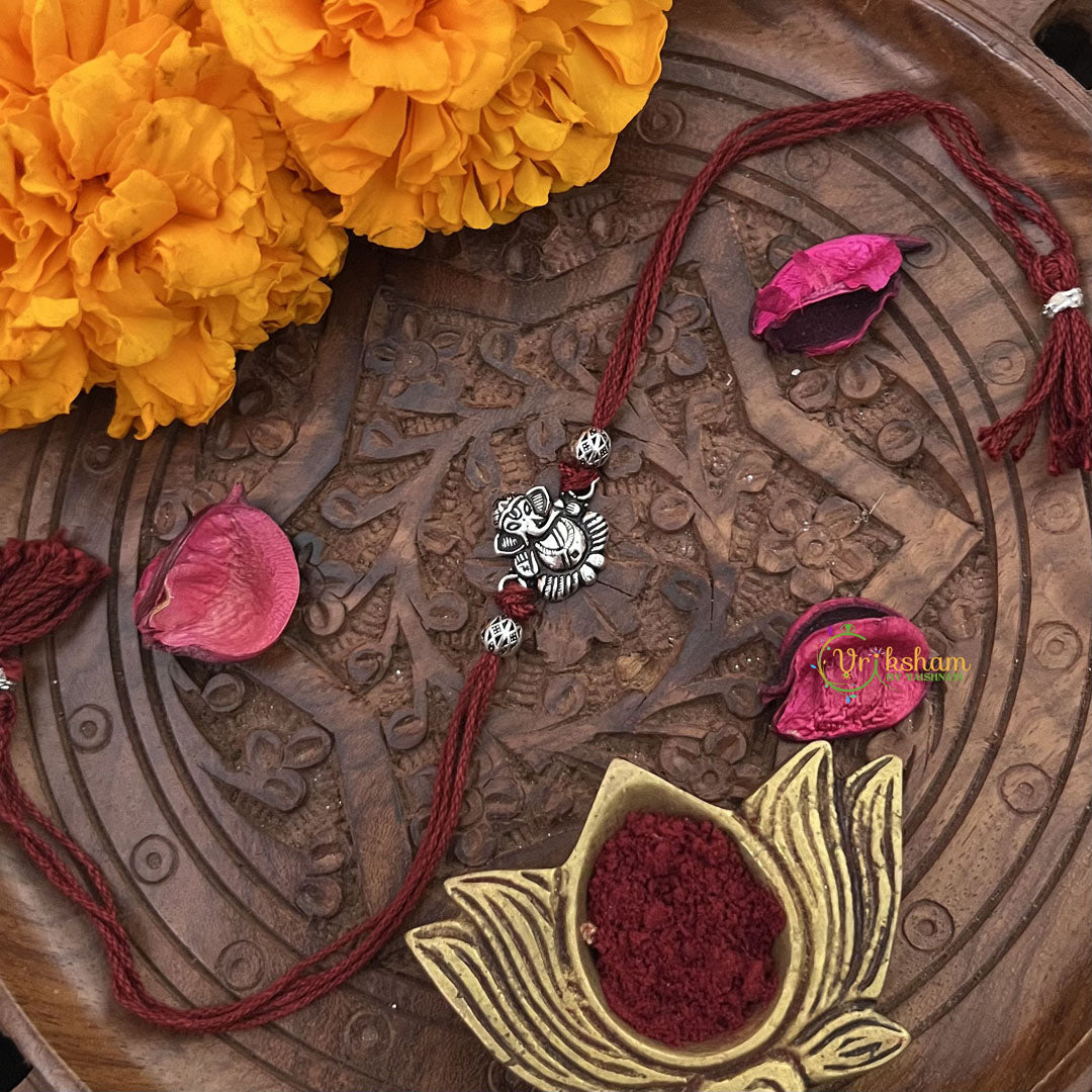 The Vriksham Rakshabandhan Silver Plated Ganraj Design Rakhi showcases a refined Ganraj motif, symbolizing strength and divine protection. Crafted with a silver-plated finish, this rakhi blends traditional artistry with elegant detail, making it a distinguished choice to honor the sacred bond of Rakshabandhan with sophistication and cultural significance.