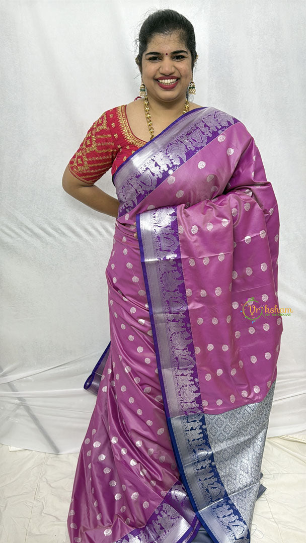 Experience timeless elegance with the Vriksham Rani Kanchi Silk Saree, featuring a rich pick color base complemented by a silver zari Palakku border. This saree exemplifies refined craftsmanship, blending traditional artistry with a subtle metallic sheen that enhances its regal appeal. Perfect for special occasions, it drapes gracefully to highlight your sophisticated style. Embrace heritage and luxury effortlessly with this exquisite piece.