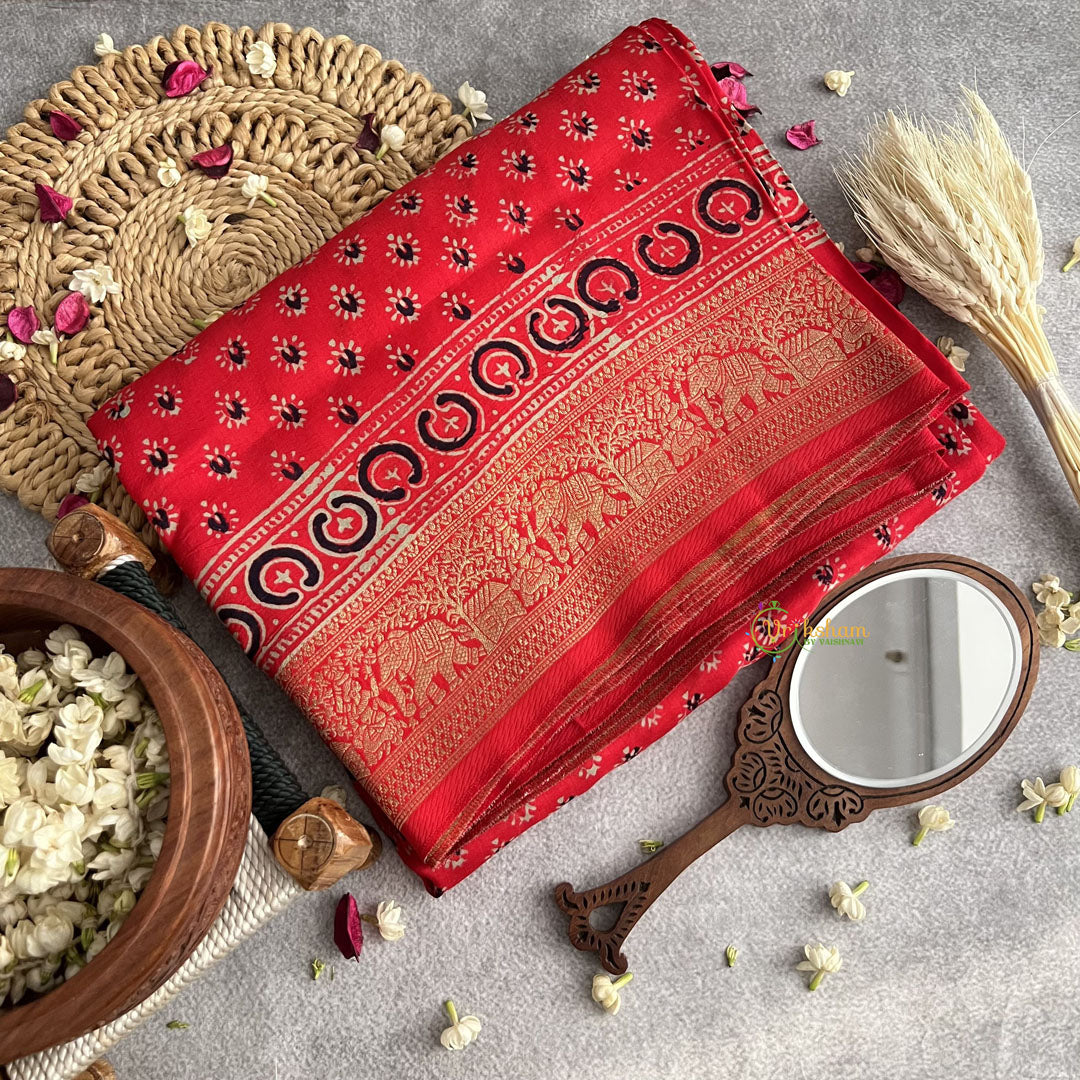 Indulge in pure luxury with our Vriksham Red Ajrakh Dola Silk Saree. Handcrafted with exquisite attention to detail, this saree boasts a unique ajrakh dola design, making it a true masterpiece. Made with premium quality silk, it drapes elegantly and will elevate your wardrobe to new heights.