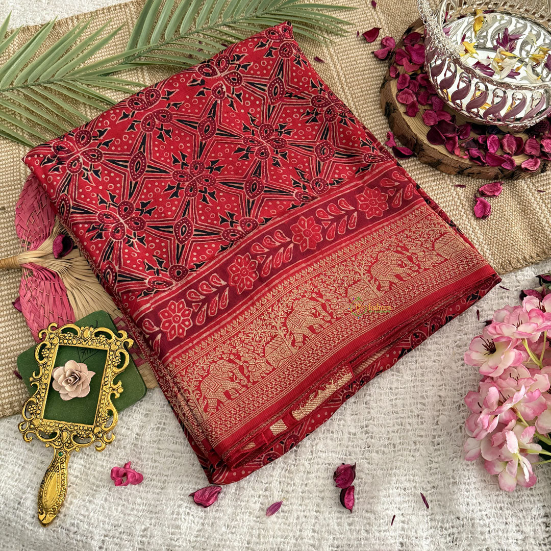 Indulge in pure luxury with our Vriksham Red With Floral Print Ajrakh Dola Silk Saree. Handcrafted with exquisite attention to detail, this saree boasts a unique ajrakh dola design, making it a true masterpiece. Made with premium quality silk, it drapes elegantly and will elevate your wardrobe to new heights.