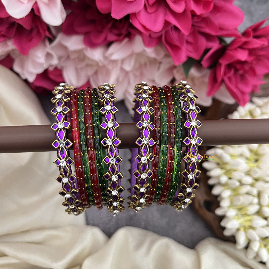 Elevate your traditional ensemble with the Vriksham Red & Green Glass Bangles, beautifully enhanced by delicate purple floral Kundan accents. Wrapped in luxurious silk thread, this bangle set offers a refined blend of vibrant colors and intricate craftsmanship, perfect for adding a touch of elegance to any occasion.