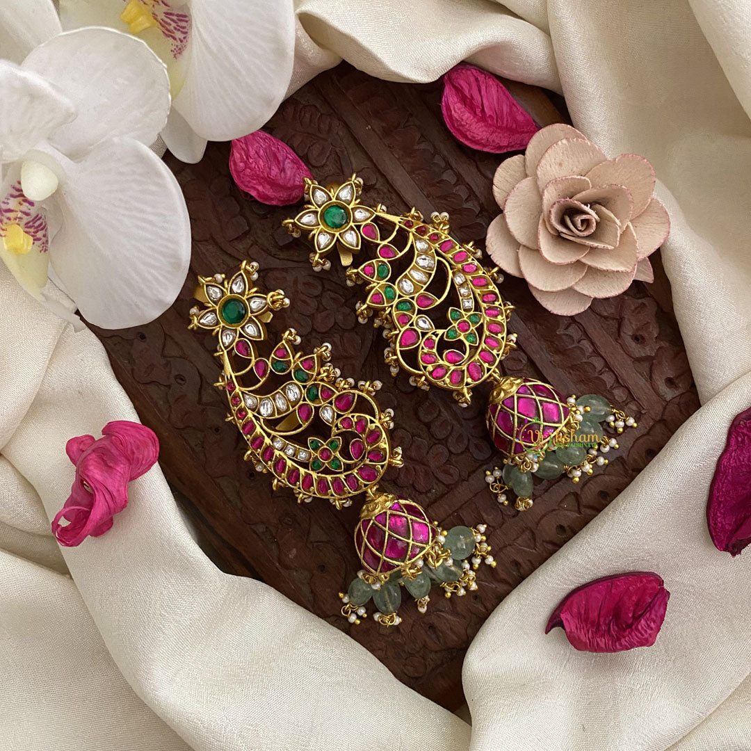 Add a touch of opulence with Vriksham's Red, Green & White Stone Kundan Jadau Cuff Jhumka. The traditional design is elevated with pastel green beads, making it a statement piece for any occasion. Indulge in the luxury of this handcrafted masterpiece.