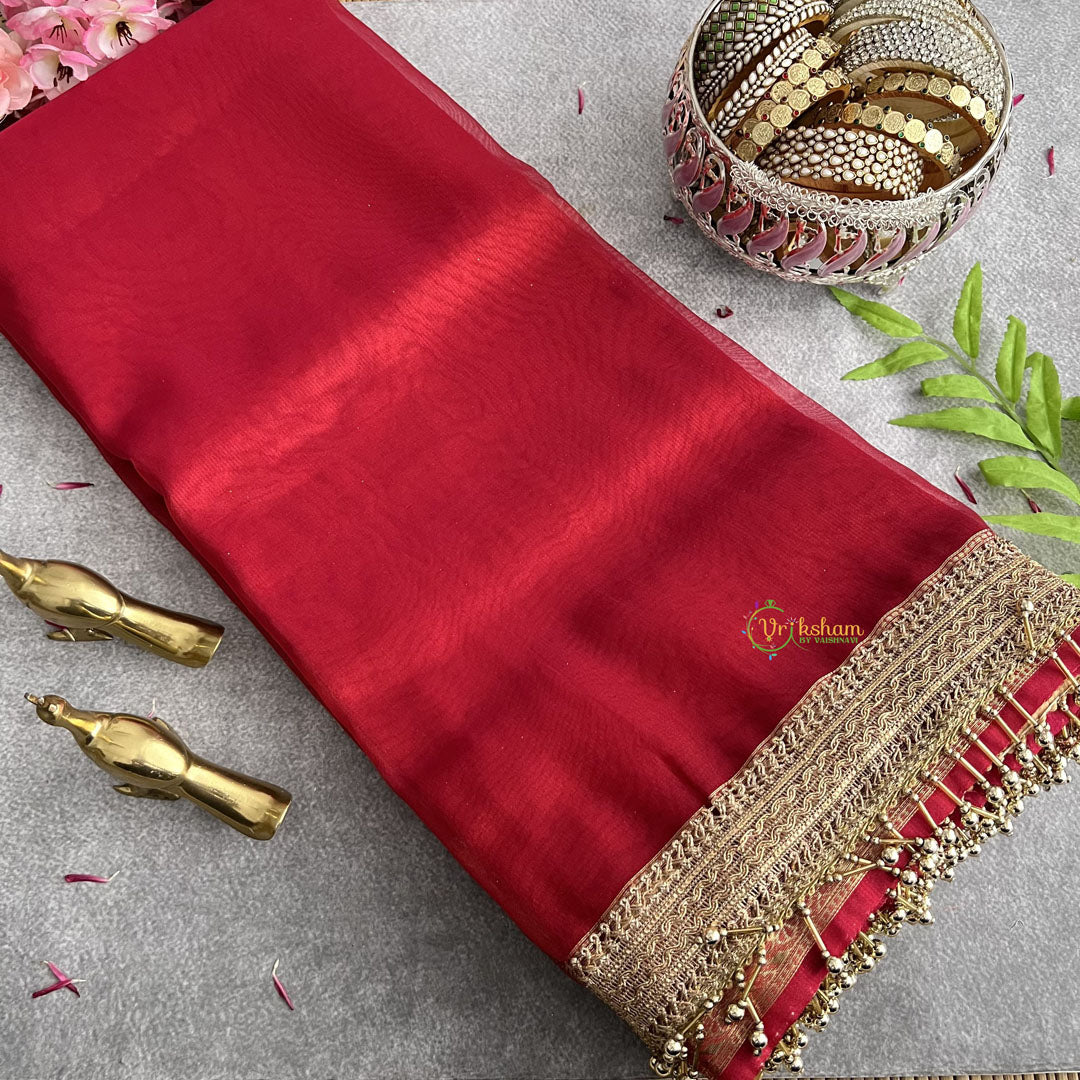 Elevate your style with the Vriksham Red Organza Saree, adorned with intricate lace and tassel work. Handloomed to perfection, this saree exudes luxury and sophistication. Make a statement at any occasion with its rich color and elegant design. Experience the beauty of art and fashion with this premium piece.