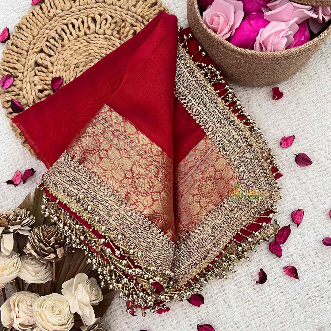 Command presence with this striking handloom organza saree in vibrant red, elevated by intricate lace and tassel work that speaks to refined artistry. The bold hue radiates confidence while the delicate embellishments add layers of sophistication and visual interest. Woven through traditional handloom craftsmanship, this saree celebrates meticulous attention to detail and cultural heritage. The organza fabric drapes with ethereal grace, while the lace detailing and tassel accents create an interplay of texture that enhances the overall aesthetic. Perfect for those who embrace bold color choices without compromising elegance, this handcrafted piece transforms special occasions into moments of personal expression. An ideal choice for the discerning wearer seeking a garment that balances vibrancy with refined sophistication and timeless appeal.