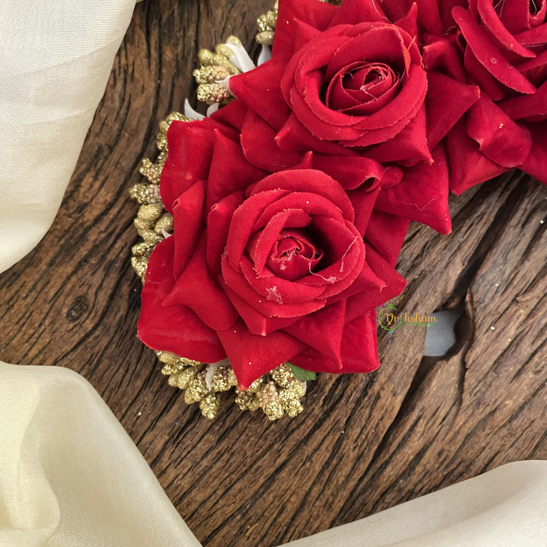 Elevate your look with Vriksham's Red Rose With White Floral Veni, adorned with intricate beads. This luxurious flower accessory adds a touch of sophistication and exclusivity to any outfit. Perfect for special occasions or everyday glamour.