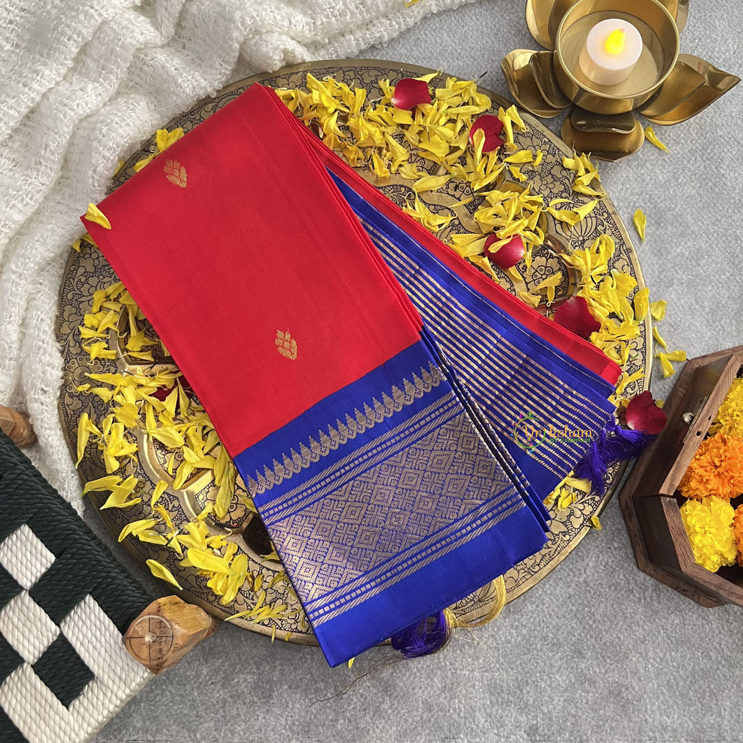 Elevate your style with the luxurious Vriksham Red With Blue Border Korvai Thiribhuvanam Silk Saree. Made from pure silk, this saree features a stunning red color adorned with a vibrant blue border. Embrace the rich craftsmanship and elegance, perfect for any special occasion.