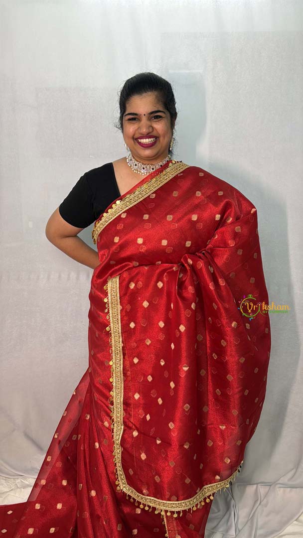 Indulge in luxury with our Vriksham Red Organza Saree, featuring intricate lace and coin tassel work. The Vriksham red color adds a pop of sophistication, while the butta design adds a touch of elegance. Handloom craftsmanship ensures the highest quality for the stylish and exclusive you.
