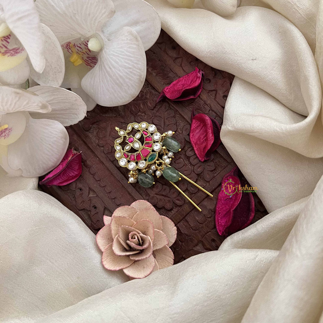 The Vriksham Regal Kundan Jadau Crescent Jada Billai features a stunning combination of red, green, and white stones set in a crescent design, accented with an aqua green bead. This exquisite accessory adds a touch of royal elegance to traditional hairstyles, perfect for weddings and special occasions. Its sophisticated craftsmanship ensures a graceful and timeless appeal.