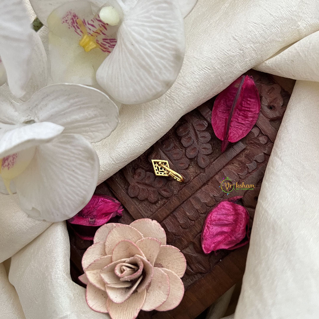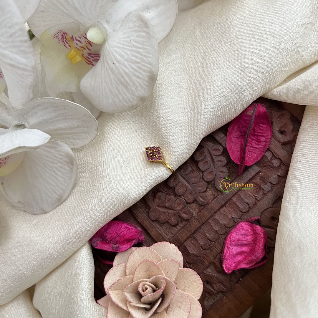 The Vriksham Regal Square Nath features a distinguished square design adorned with red gemstones, complemented by delicate pearls. This press-fit nose pin combines regal elegance with comfortable wear, making it an exquisite accessory to enhance your traditional ensemble with a sophisticated flair.