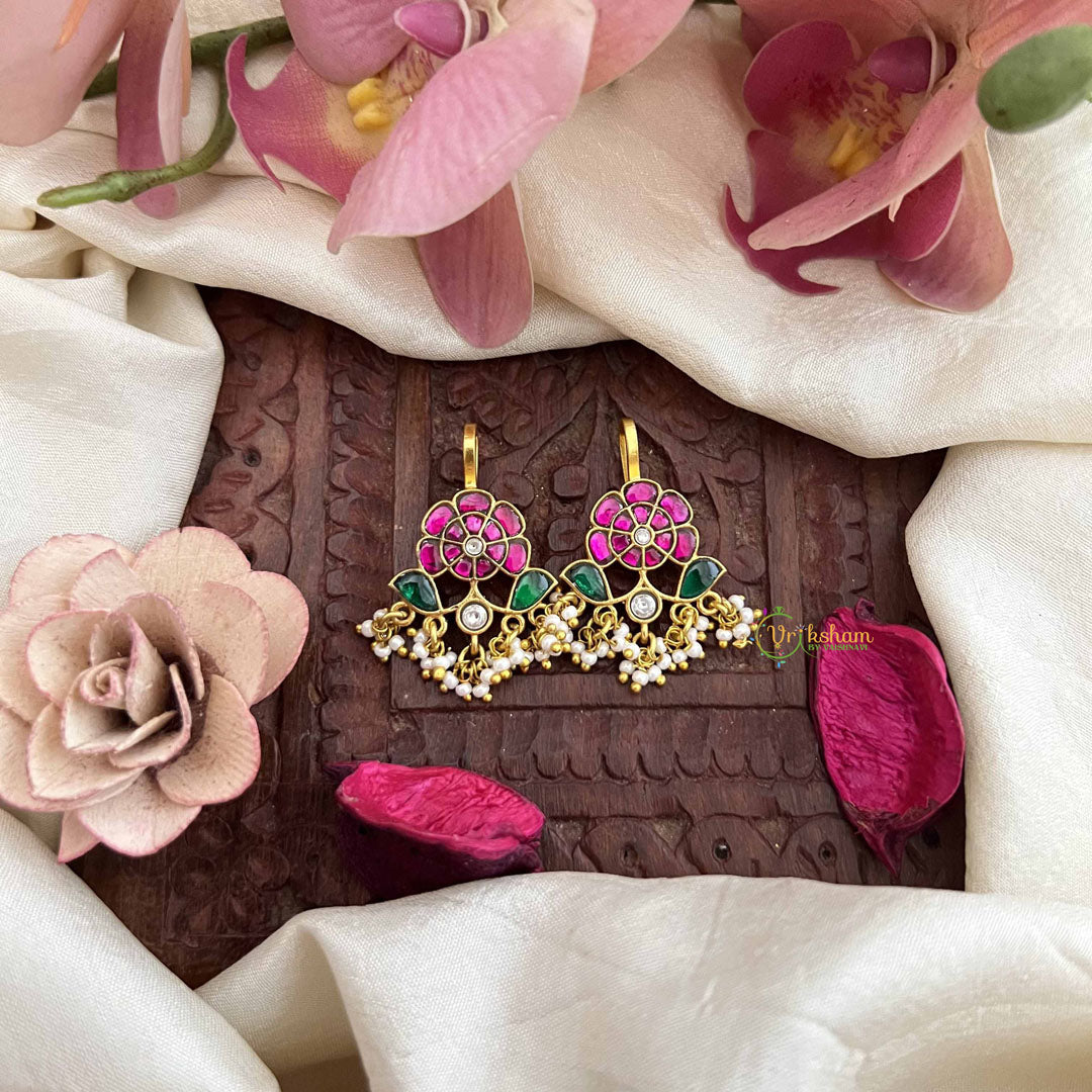 Elevate your ensemble with the Vriksham Rose Floral Style Kundan Jadau Press Bugadi. Featuring exquisite pearls and intricate Kundan Jadau craftsmanship in red, white, and green, this piece captures timeless floral elegance. Its sophisticated design adds a graceful and refined touch, ideal for special occasions and traditional celebrations.