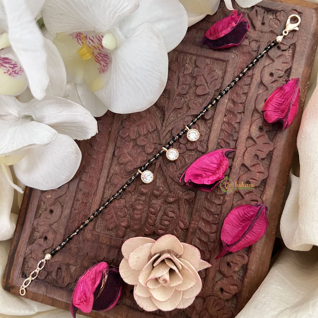 Elevate your look with our Vriksham Ad Stone Three Round Stone Mangalsutra Bracelet. Crafted with sophistication and featuring three round stones, this bracelet is a luxurious addition to your jewelry collection. Perfect for any occasion, it adds a touch of elegance and grace to your ensemble. Embrace exclusivity with this striking piece.