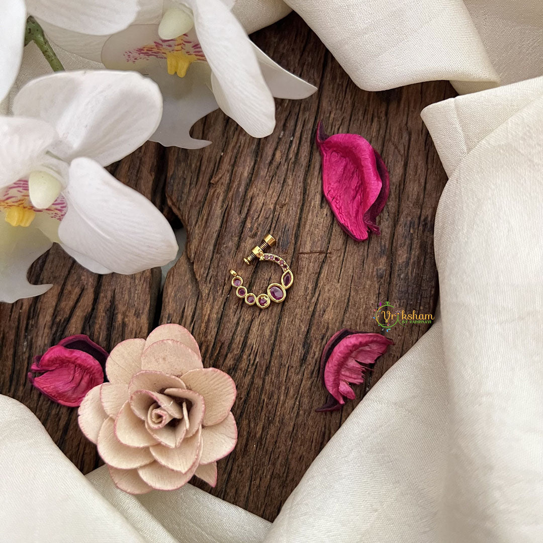 The Vriksham Round Style Naths features a graceful blend of red and hues in a timeless round design. This meticulously crafted nose pin combines classic elegance with subtle color contrast, making it a sophisticated accessory that enhances any ensemble with refined charm.