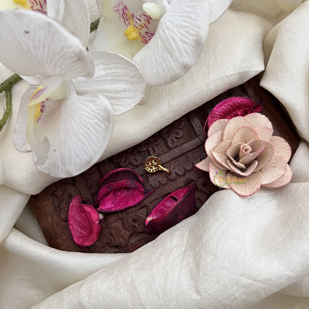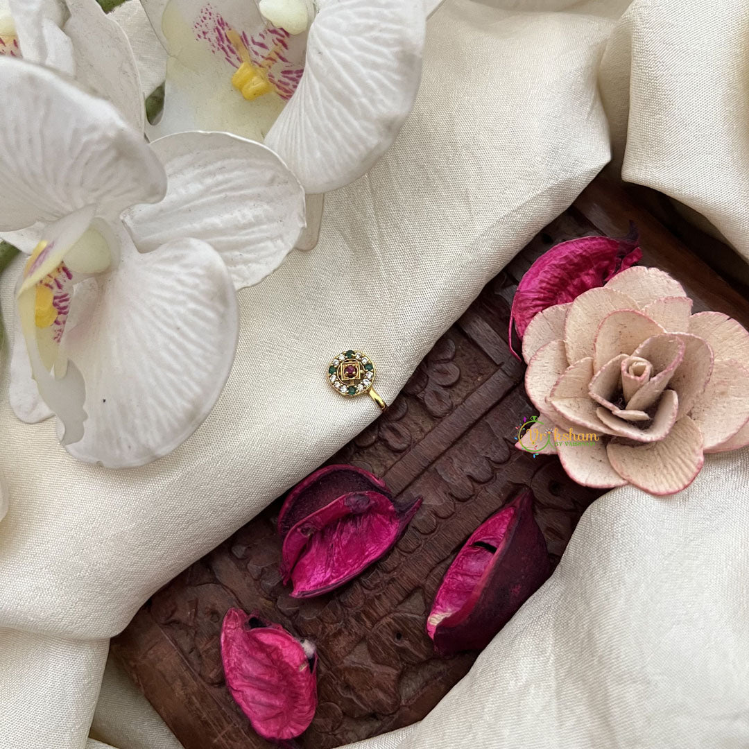 The Vriksham Round With Diamond Style Nath features a circular design embellished with red, white, and green stones that evoke the brilliance of diamonds. Its press-on style provides comfortable wear, adding a refined and sophisticated sparkle to your traditional look.