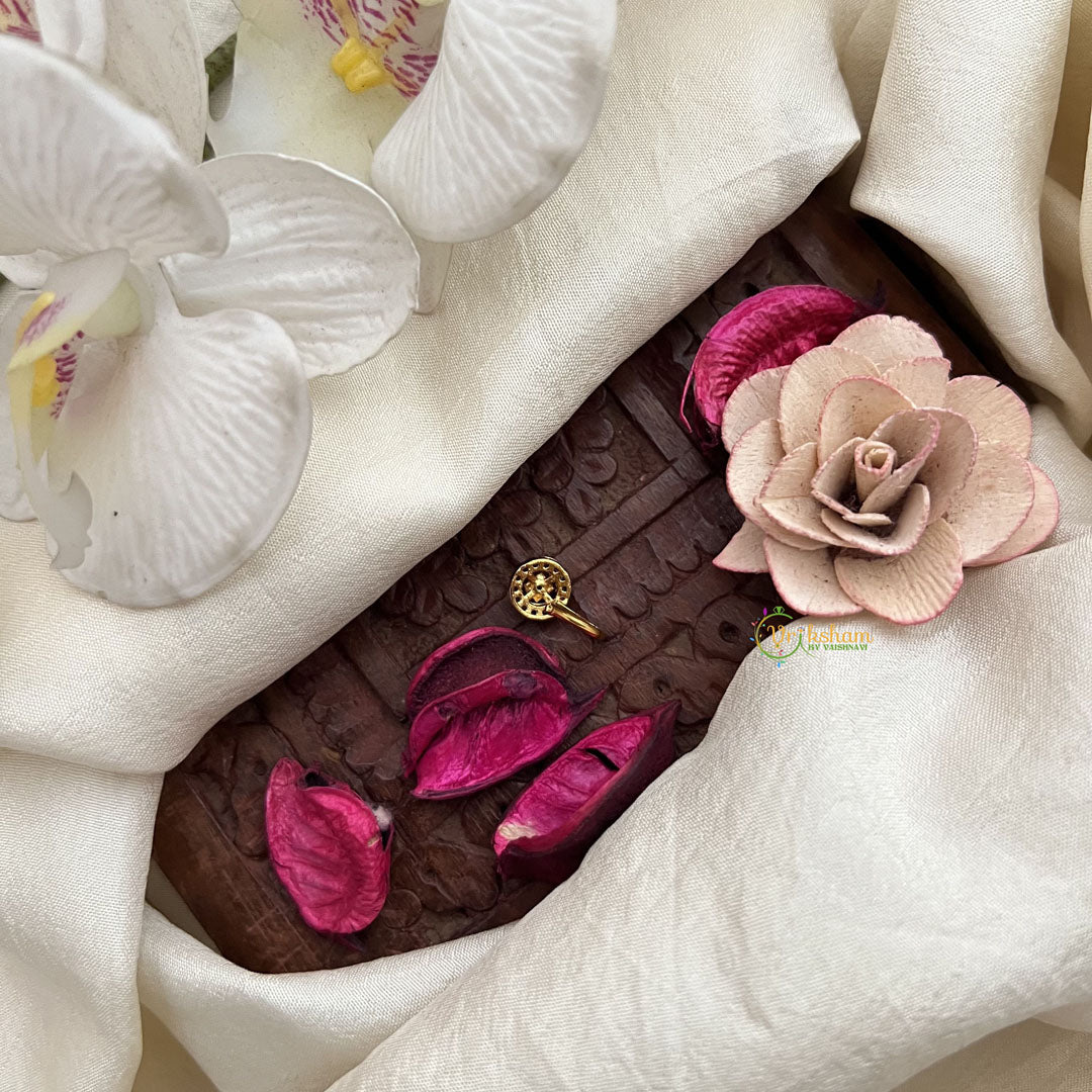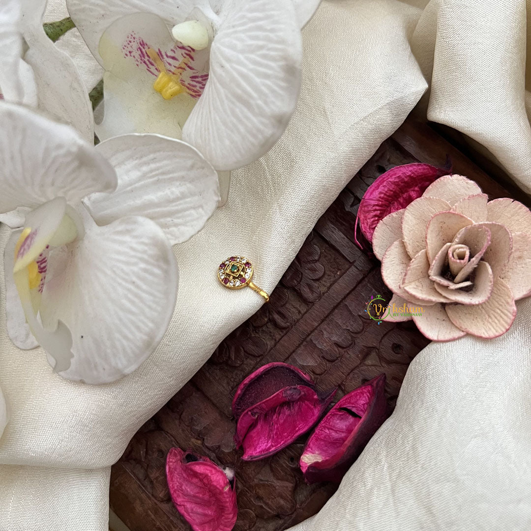The Vriksham Round With Diamond Style Nath features a refined circular design adorned with red, white, and mid-green stones. Its press-on style ensures comfortable wear while adding a subtle yet sophisticated sparkle to elevate your traditional ensemble.