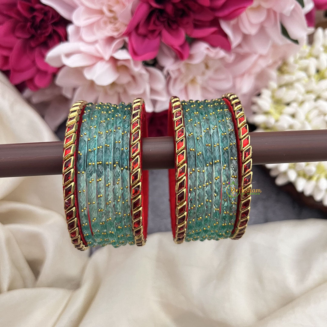 The Vriksham Royal Aqua Blue Bangles showcase a stunning contrast with vibrant aqua blue hues accented by elegant ruby red meenakari borders. Crafted to perfection, these bangles bring a sophisticated charm to your look, making them an ideal choice for both festive and formal occasions. Their refined design enhances any outfit with a touch of timeless beauty.