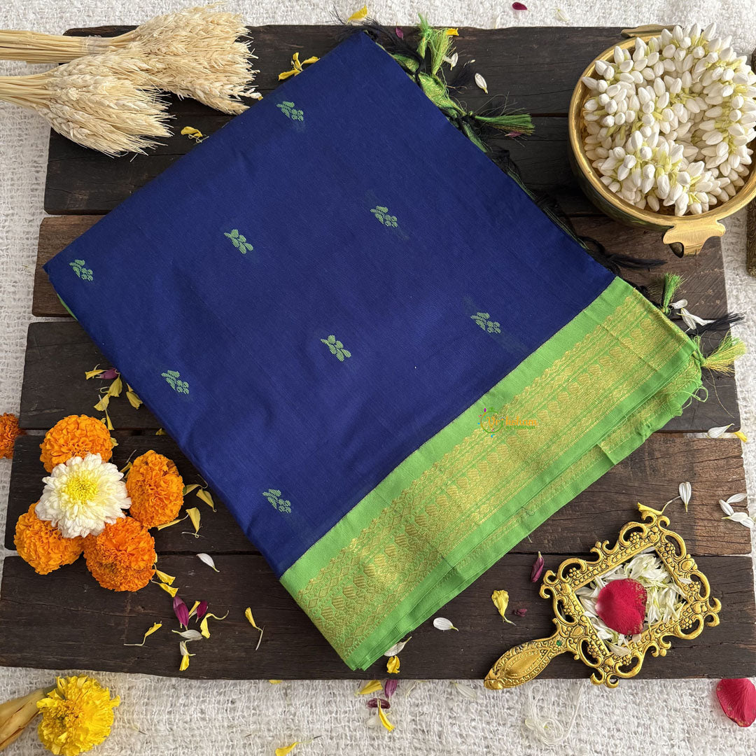 The Vriksham Royal Blue Kalyani Cotton Saree, highlighted by a vibrant lime green border, offers a striking blend of boldness and elegance. Made from soft, breathable cotton, it ensures comfort while making a refined statement. Ideal for festive occasions or stylish everyday wear, this saree adds a sophisticated edge to your wardrobe.