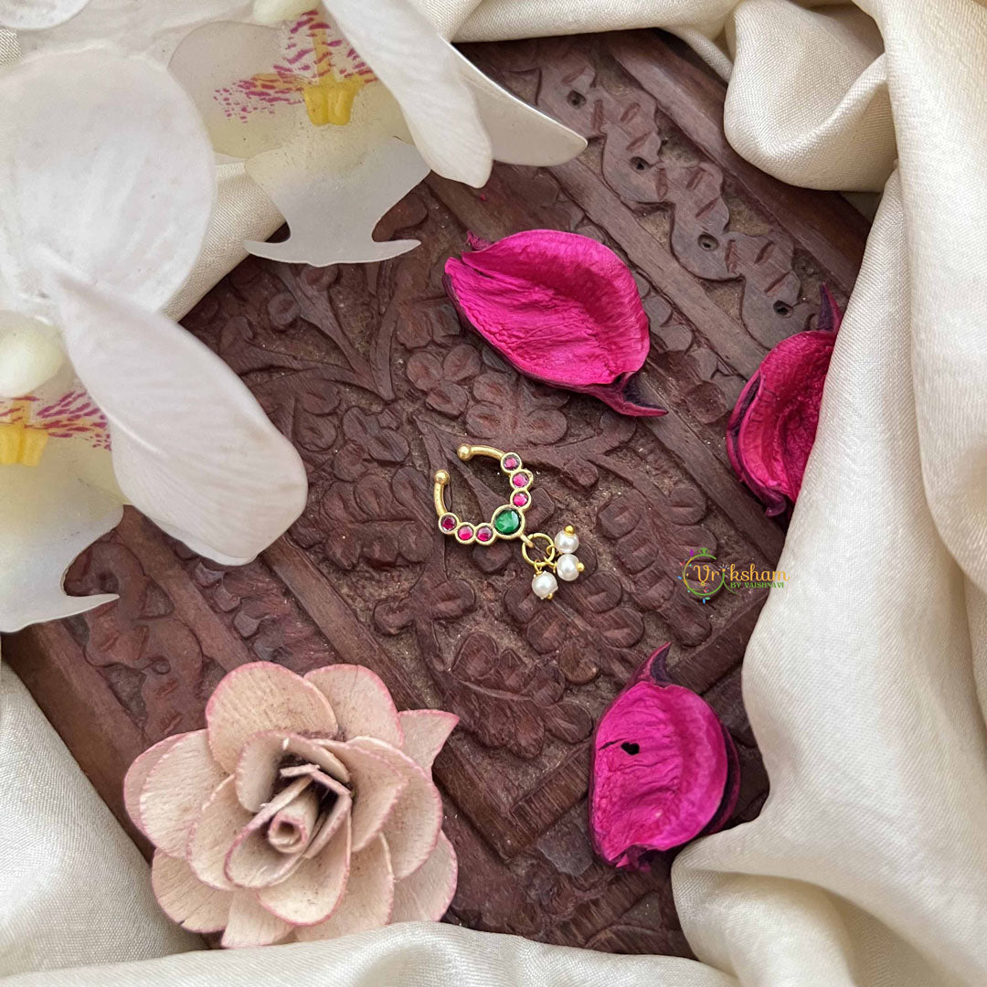 The Vriksham Royal Blush Septum Ring in Gold Tone-Green Red combines vibrant green and red accents with a rich gold-tone finish. This sophisticated design offers a bold yet elegant statement, perfectly suited to complement traditional and festive ensembles with timeless grace and refined color contrast. Ideal for elevating your special occasion look.
