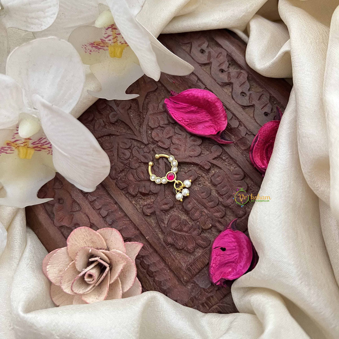 The Vriksham Royal Blush Septum Ring in Gold Tone-White Red features a graceful blend of white and red accents set against a radiant gold-tone finish. This sophisticated piece enhances any outfit with its striking yet refined design, perfect for adding a touch of elegant color and timeless charm to your traditional or contemporary look. Ideal for special occasions and celebrations.
