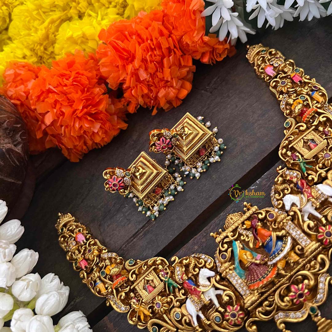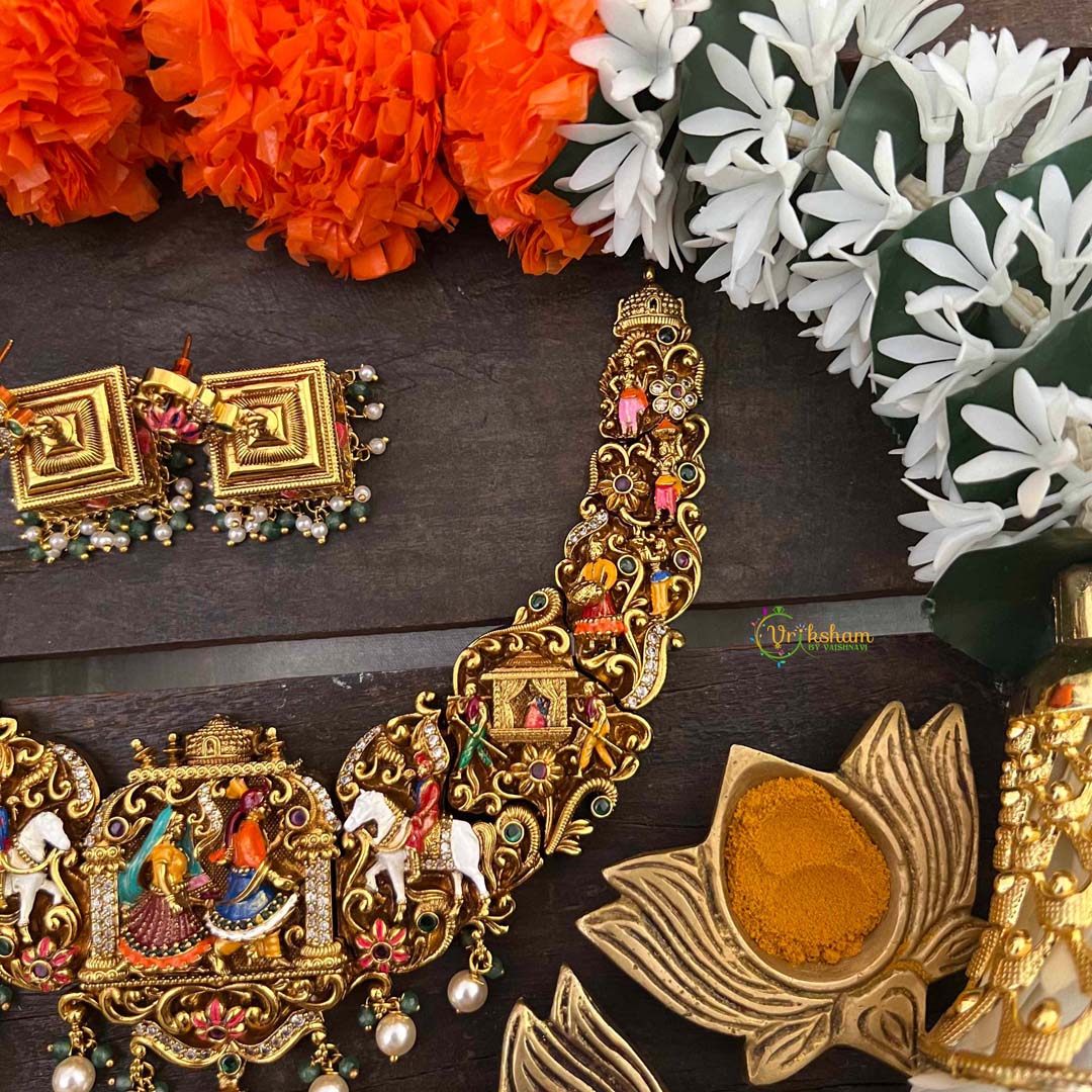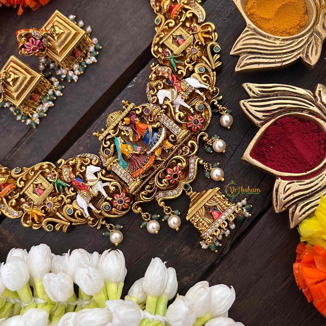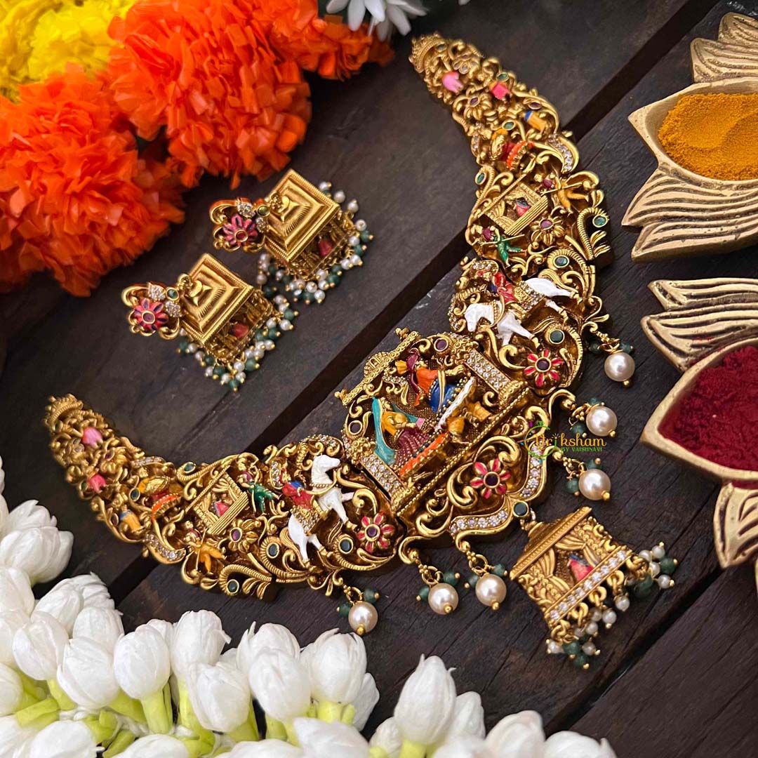 Step into regal splendor with our Royal Bridal Procession Palki Enamel Short Neckpiece, a majestic tribute to traditional wedding grandeur. This exquisite piece captures the essence of ceremonial elegance with its ornate palki (palanquin) motif rendered in vibrant enamel work and lustrous gold-toned brass. The intricate detailing showcases the artistry of heritage jewelry craftsmanship, perfect for brides seeking a distinctive statement piece that honors cultural traditions. The short neckpiece length offers comfortable wear while commanding attention with its elaborate design. Crafted with premium materials and meticulous attention to detail, this necklace transforms any bridal ensemble into a show-stopping display of sophistication. Ideal for wedding processions, receptions, and festive celebrations. Discover Vriksham's mastery in creating jewelry that tells stories of royal heritage and timeless beauty.