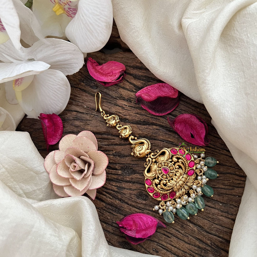 The Vriksham Royal Elephant Temple Style Maang Tikka in Red with Green Beads features intricate temple-inspired designs highlighting majestic elephant motifs. This sophisticated accessory blends vibrant colors with detailed craftsmanship, adding a regal and traditional elegance to your ethnic ensemble for special occasions and celebrations.