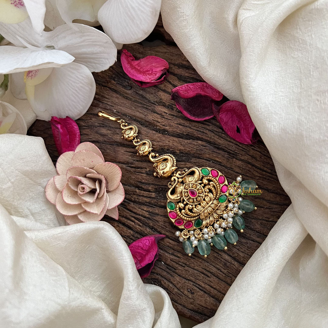 The Vriksham Royal Elephant Temple Style Maang Tikka in Red and Green with Green Beads features intricate temple-inspired designs highlighting majestic elephant motifs. This sophisticated accessory blends vibrant colors with detailed craftsmanship, adding a regal and traditional elegance to your ethnic ensemble for special occasions and celebrations.