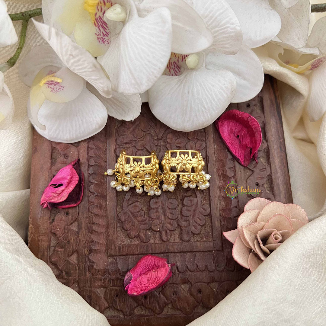 Radiate regal magnificence with this opulent royal bugadi, where golden craftsmanship meets floral artistry. This luxurious piece features an exquisite design adorned with delicate floral motifs complemented by lustrous pearls that cascade gracefully across the gold-plated surface. The harmonious blend of precious elements creates an ethereal, multi-dimensional aesthetic that captures light beautifully. The secure press mechanism ensures comfortable, all-day wearability without compromising on elegance. Perfect for grand weddings, royal celebrations, and formal occasions, this bugadi epitomizes sophistication and timeless beauty. An heirloom-quality accessory that celebrates the finest traditions of Indian jewelry artistry, destined to become a cherished treasure that radiates grace, opulence, and cultural pride through generations.