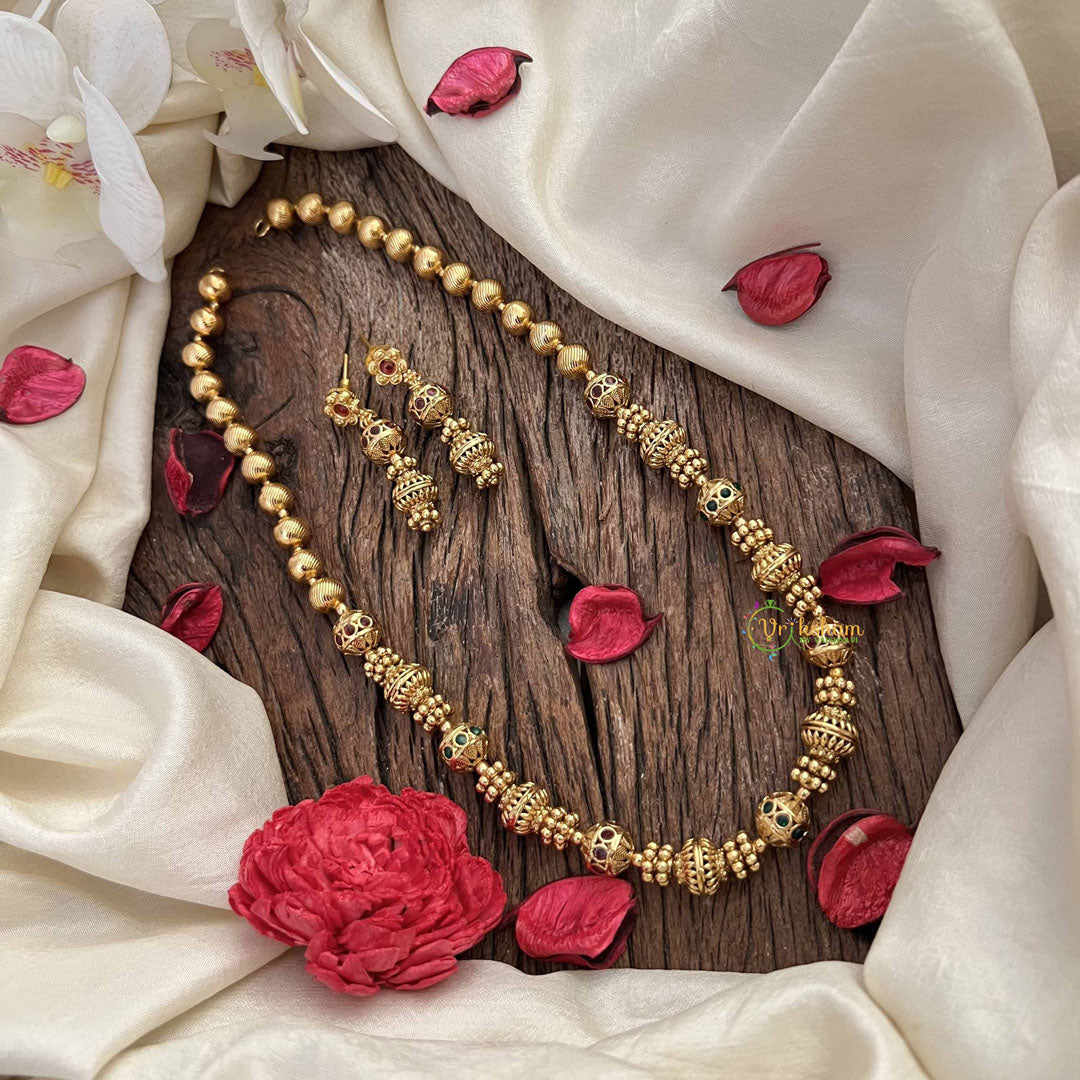 The Vriksham Royal Golden Grace Beaded Neckpiece exudes majestic elegance with its lustrous golden beads and refined craftsmanship. Designed to complement both traditional and contemporary looks, this neckpiece adds a sophisticated touch of grandeur and timeless allure to any ensemble.