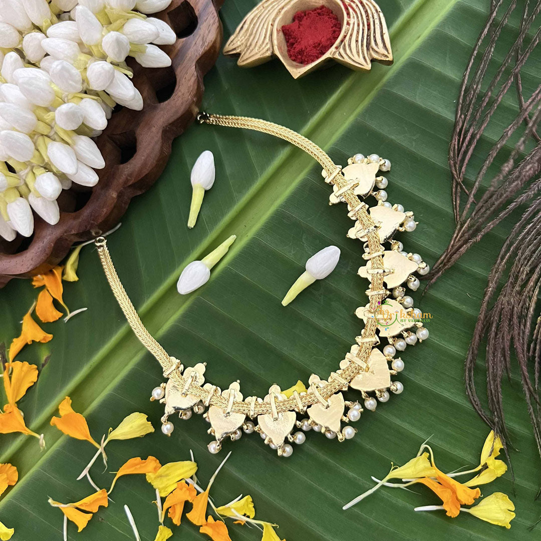 The Vriksham Royal Grace Gold Look Precious Kemp With Pearl Short Neckpiece in red and green combines elegant gold tones with vibrant kemp stones and delicate pearls. This sophisticated design offers a refined and timeless accessory, ideal for enhancing your special occasion attire with a graceful and regal touch.