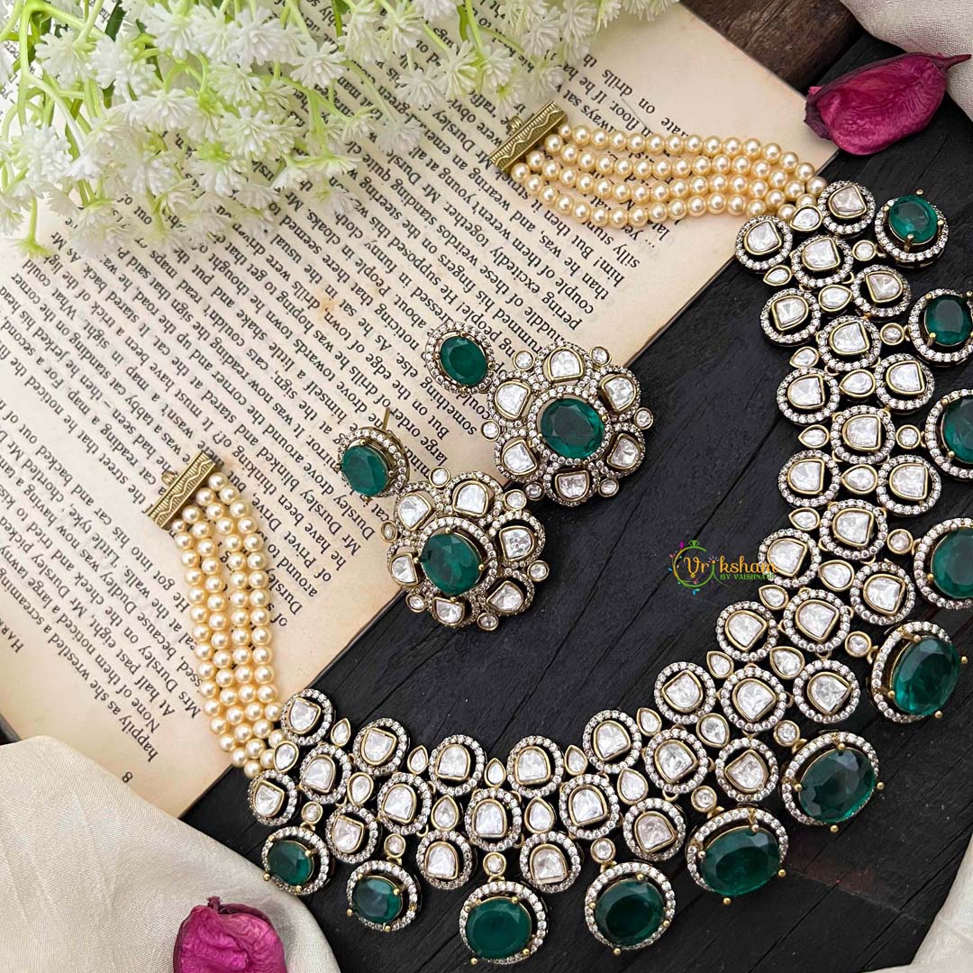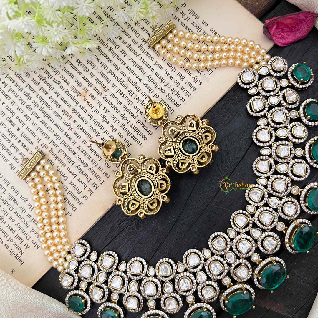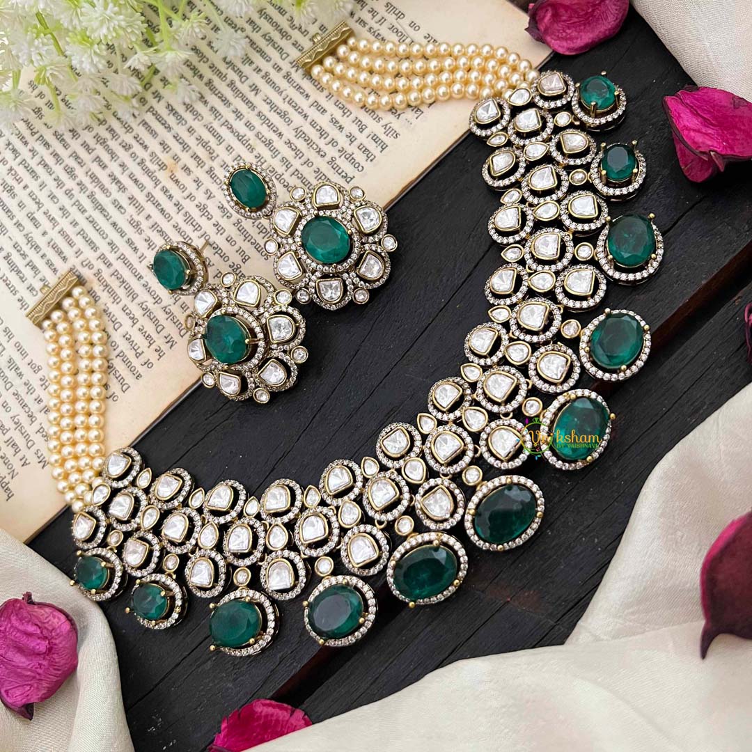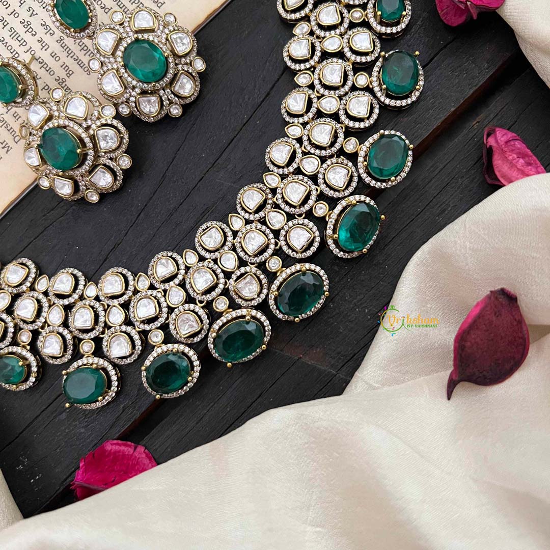 Experience regal elegance with this royal green Polki bridal choker neckpiece, beautifully adorned with sparkling AD stones. Its intricate craftsmanship and rich green accents create a timeless statement piece, perfect for complementing bridal attire with sophistication and grace.