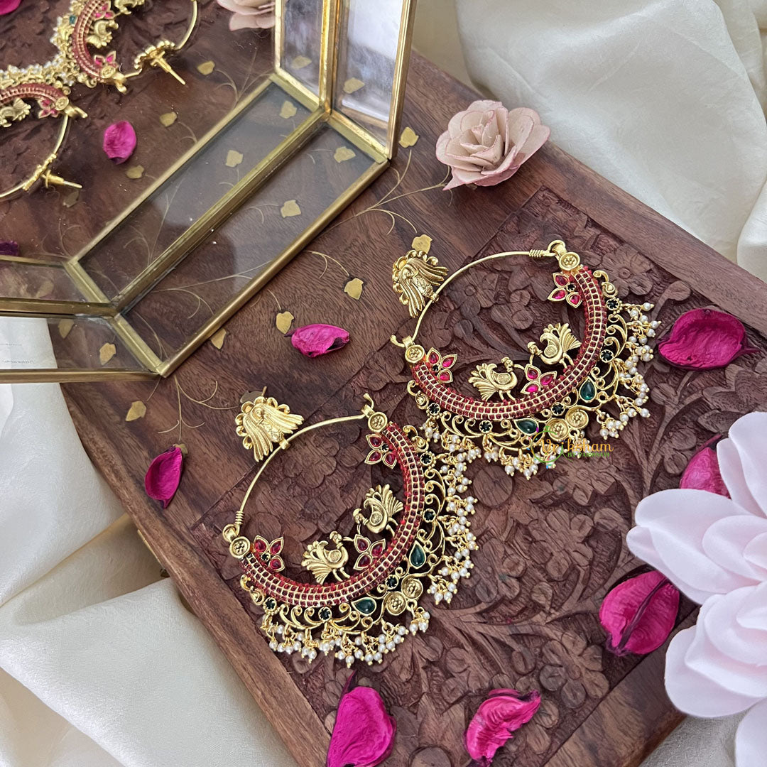 Royal Kemp Chandbalis -Red and green semi precious kemp and premium quality matt chandbali earring with dual peacocks and flower designs. with pearl finish.