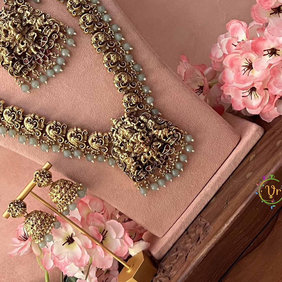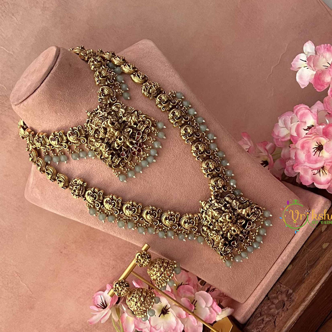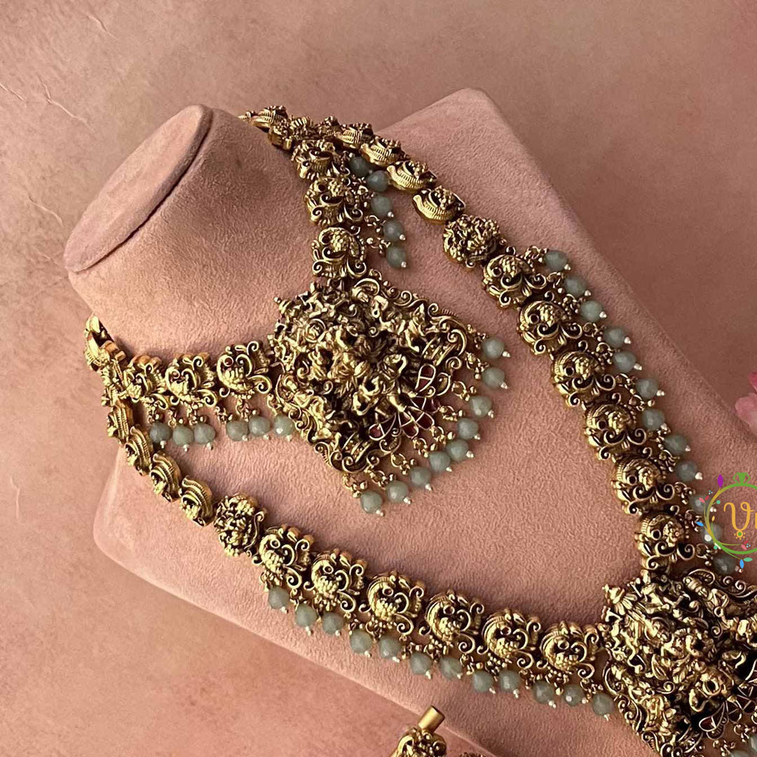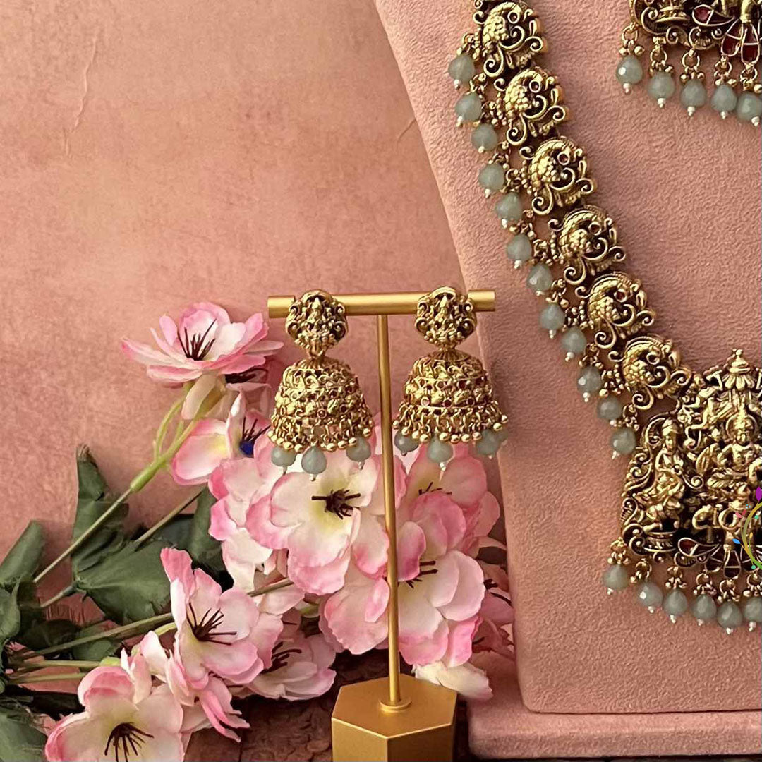 Indulge in regal splendor with this magnificent Royal Lakshmi Temple Bridal Set, featuring an elegant antique gold finish that exudes timeless luxury. Adorned with serene aqua green beads that symbolize tranquility and abundance, this collection showcases intricate temple-inspired motifs rendered in warm, vintage-toned metalwork. Each piece is expertly crafted to blend classical South Indian aesthetics with refined sophistication, creating an heirloom-quality ensemble. Ideal for the bride who appreciates understated opulence and meaningful symbolism, this set delivers graceful beauty and cultural resonance for your most treasured occasions.