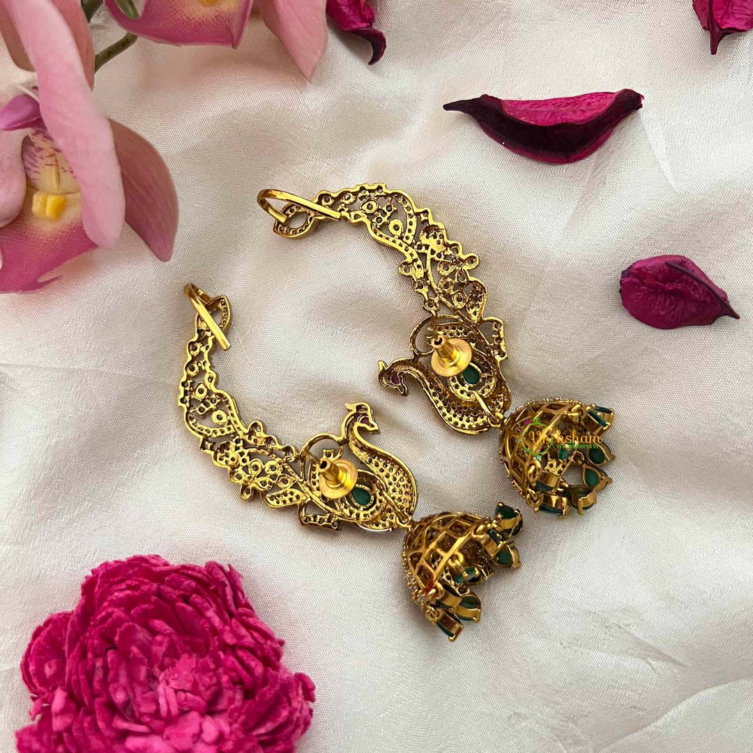 Color, shades, texture displayed may slightly vary from the actual product due to photography limitations. We humbly request you to consider these variations. We try Elevate your elegance with the Vriksham Royal Peacock Kundan Jadau Jhumkas, exquisitely crafted with intricate peacock motifs and adorned with lustrous pearls. The detailed maatil design is complemented by matching ear cuffs, creating a harmonious and regal accessory set perfect for special occasions. This sophisticated jewelry merges traditional craftsmanship with timeless beauty, enhancing your ensemble with a graceful, luxurious touch.our best to deliver the product pictures to 99% similar to the actual product. BEWARE of IMAGE RE-USAGE/COPYRIGHT VIOLATION across the INTERNET. This image belongs to www.vrikshamindia.com only. It is authentically taken by our in-house photographers in natural light without any editing or filters in place and is copyrighted to us. Any stealing/infringement or usage of this pic for sales/advertisement purposes is subject to legal action.