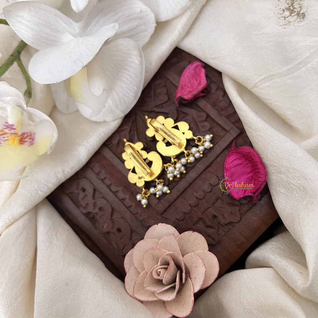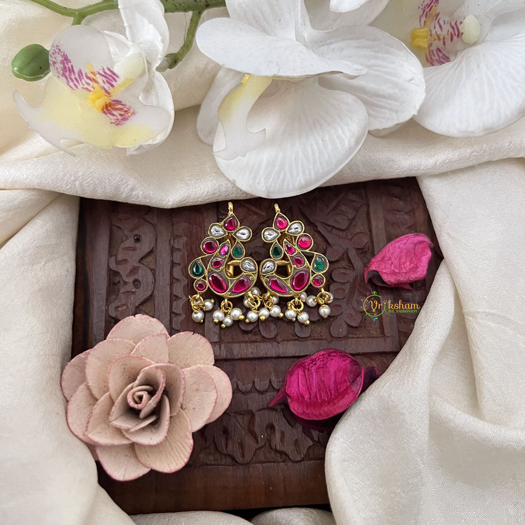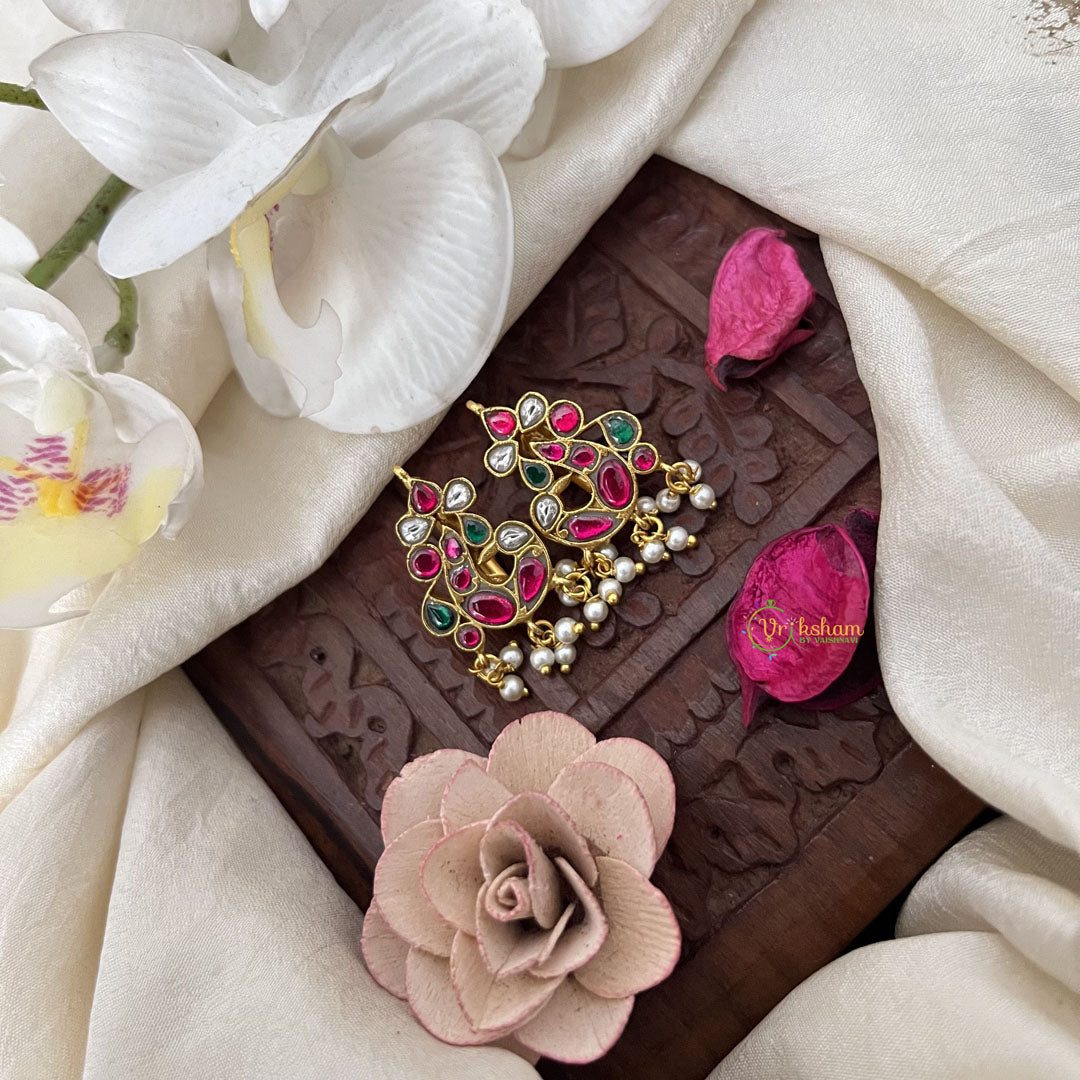 The Vriksham Royal Peacock Nakshi Jadau Press Bugadi in red, green, and white, accented with pearls, features an exquisite peacock nakshi design crafted with intricate kundan and jadau artistry. This sophisticated accessory adds a regal and timeless elegance to traditional attire, perfect for elevating your look on special occasions with refined beauty.