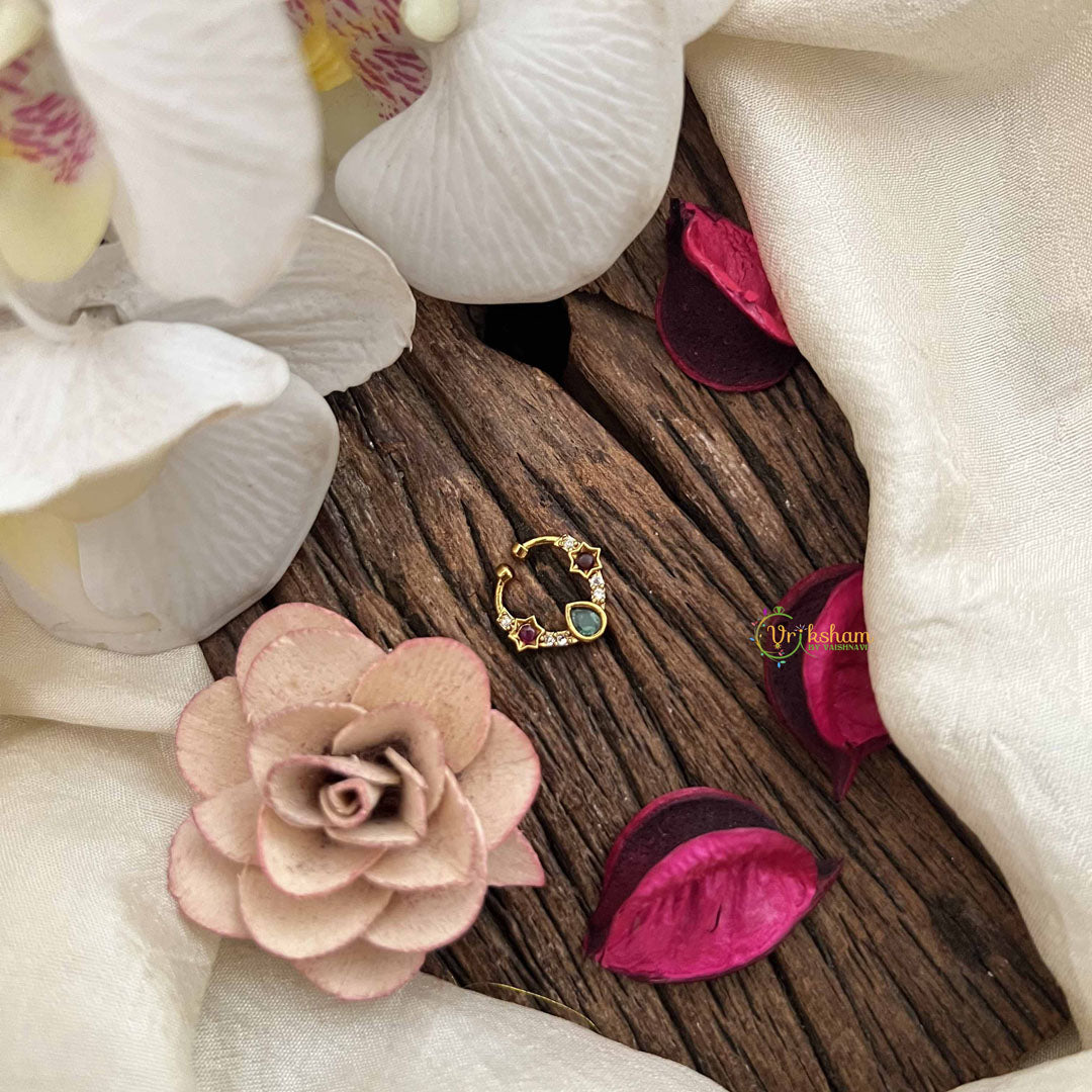 The Vriksham Royal Pear with Star Shape Septum Ring features a gold-toned finish elegantly embellished with red and green stones. Its distinctive pear and star motifs combine regal style with intricate craftsmanship, creating a sophisticated accessory that adds a refined and unique statement to your ensemble.