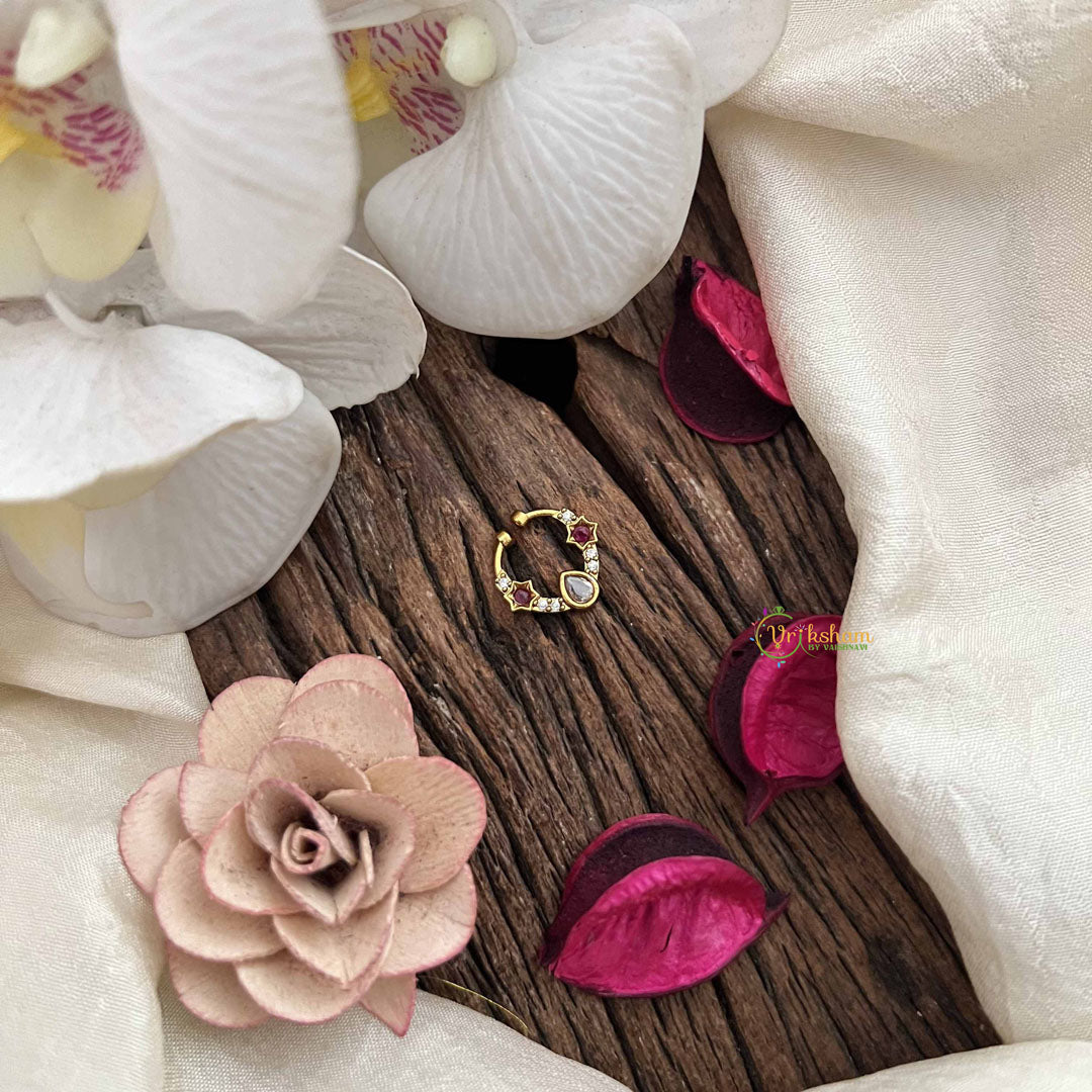 The Vriksham Royal Pear with Star Shape Septum Ring combines a gold-toned finish with elegant red and white stones. Featuring unique pear and star motifs, this ring offers a refined and sophisticated accessory that enhances your look with timeless charm and distinctive design.