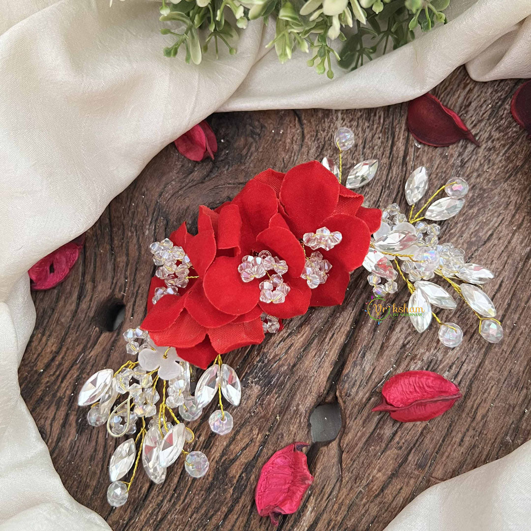 The Vriksham Royal Red Rose Floral Crystal Leaf Beads Gajra features rich royal red roses accented with sparkling crystal beads and delicate leaf details. This sophisticated accessory adds a luxurious and elegant touch to traditional hairstyles, perfect for weddings and special occasions.