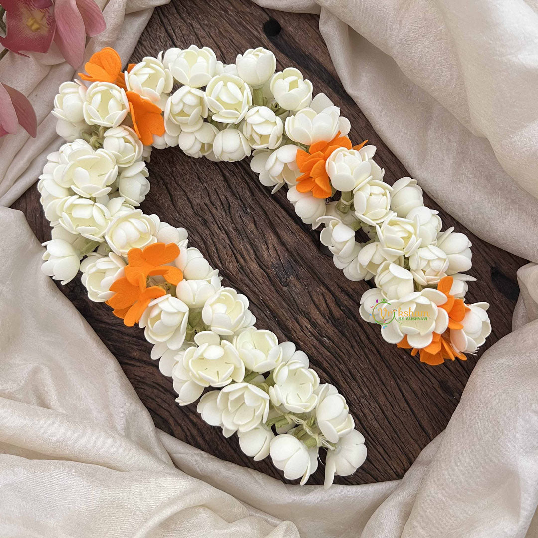Enhance your traditional ensemble with the Royal White & Orange Flower Touch Jasmin Gajra. Measuring this exquisite accessory features a regal blend of white and orange jasmin blossoms, delivering a subtle fragrance and refined vibrancy. Perfect for weddings and festive occasions, it adds a sophisticated floral touch to your hairstyle. Rest all crushable/ water proof / very very light weight/ long lasting foam flowers