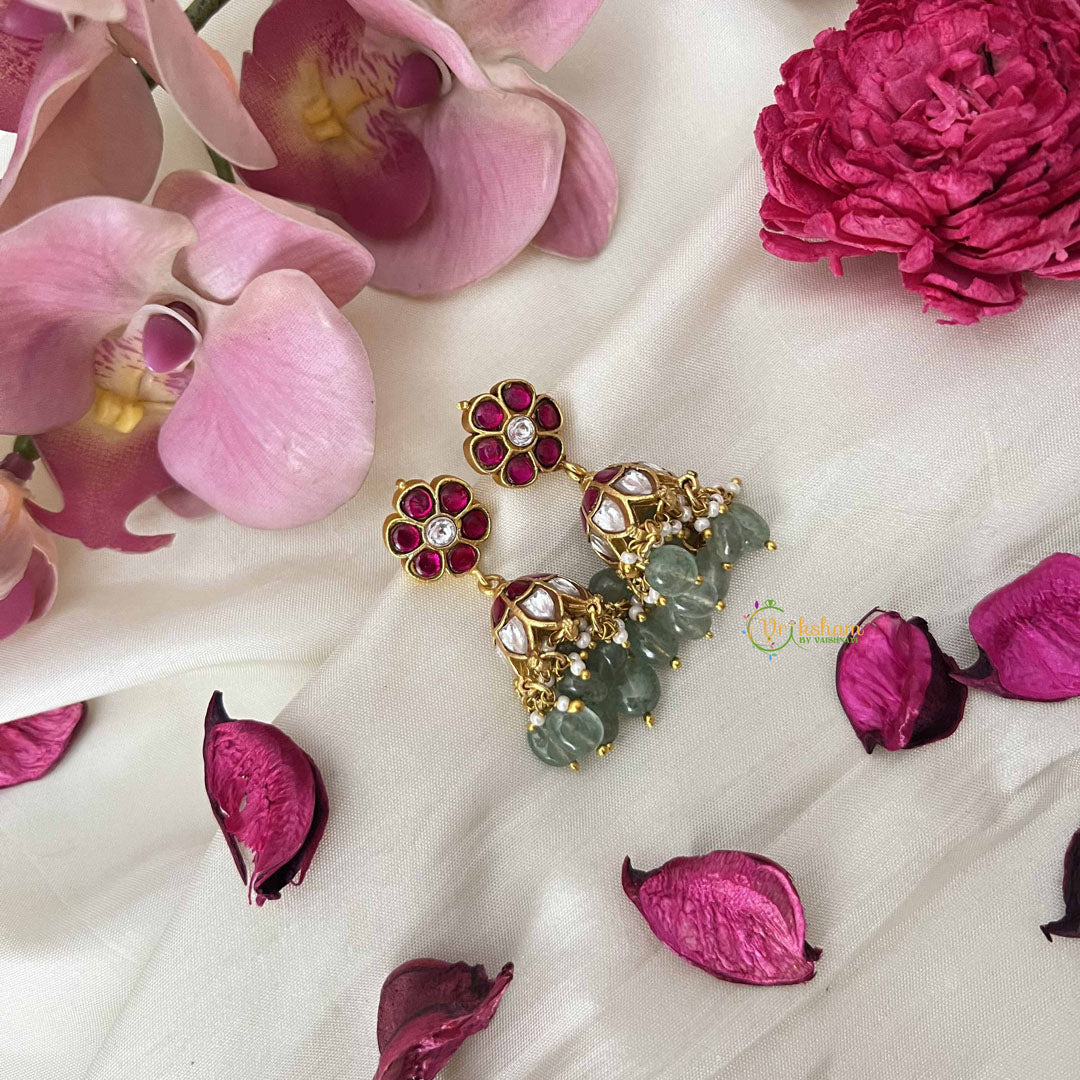Elevate your elegance with the Vriksham Ruby Blossom Kundan Jadau Jhumkas, exquisitely crafted with vibrant green beads and lustrous pearls. These intricate jhumkas showcase traditional Kundan artistry blended with delicate floral motifs, making them perfect for sophisticated occasions. Their rich design promises to add a timeless charm and graceful allure to your ensemble.