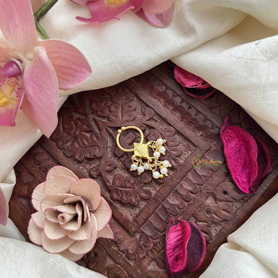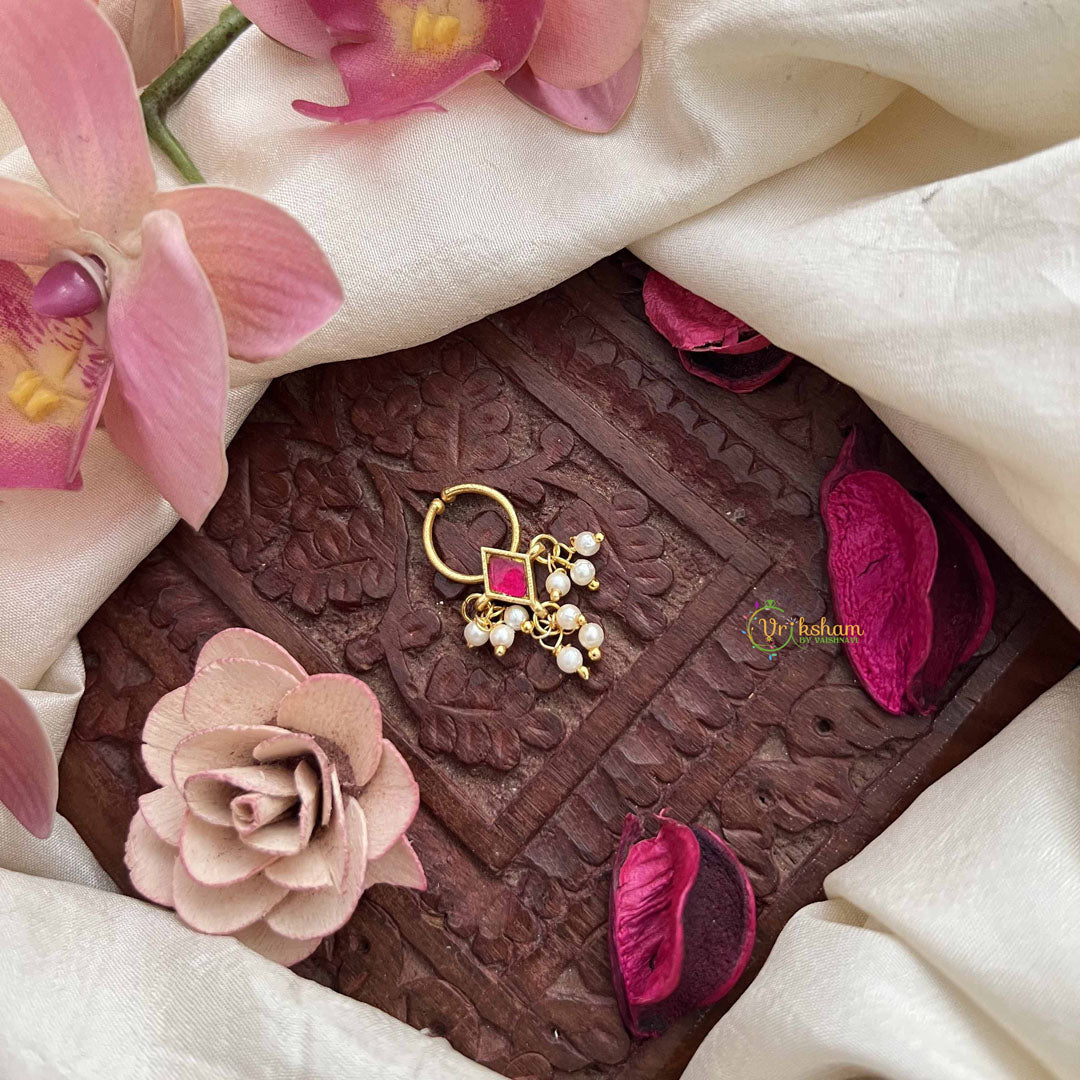 Elevate your traditional look with this exquisite gold-toned Kundan Jadau septum ring, featuring a radiant ruby center surrounded by delicate pearl clusters. Meticulously crafted, it blends timeless elegance with intricate artistry, making it a perfect statement piece for special occasions. Its refined design promises to enhance your ensemble with a subtle yet captivating charm.