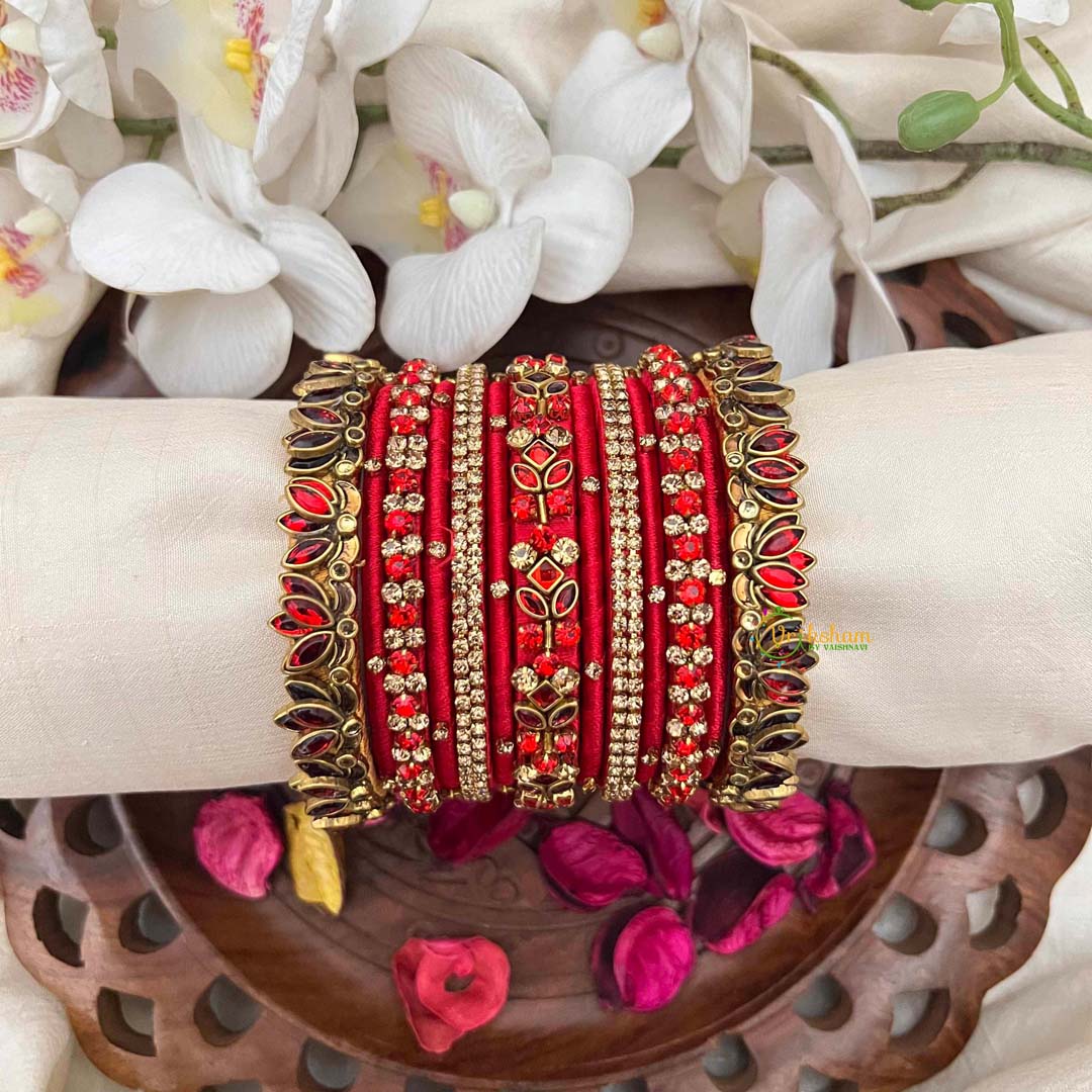 Discover timeless elegance with this comprehensive 26-piece ruby red bangle collection, meticulously crafted from luxurious silk and adorned with sparkling zircon accents. Each bangle in this curated set showcases refined detailing that captures light beautifully, offering versatility for layering or wearing individually. The deep crimson shade provides a striking foundation for traditional and contemporary styling, making it an essential addition to your festive jewelry wardrobe. Designed for those who appreciate quality craftsmanship and understated opulence, this expansive collection ensures you have the perfect complement for every occasion—from intimate gatherings to grand celebrations. Experience the perfect marriage of heritage artistry and modern sophistication.
