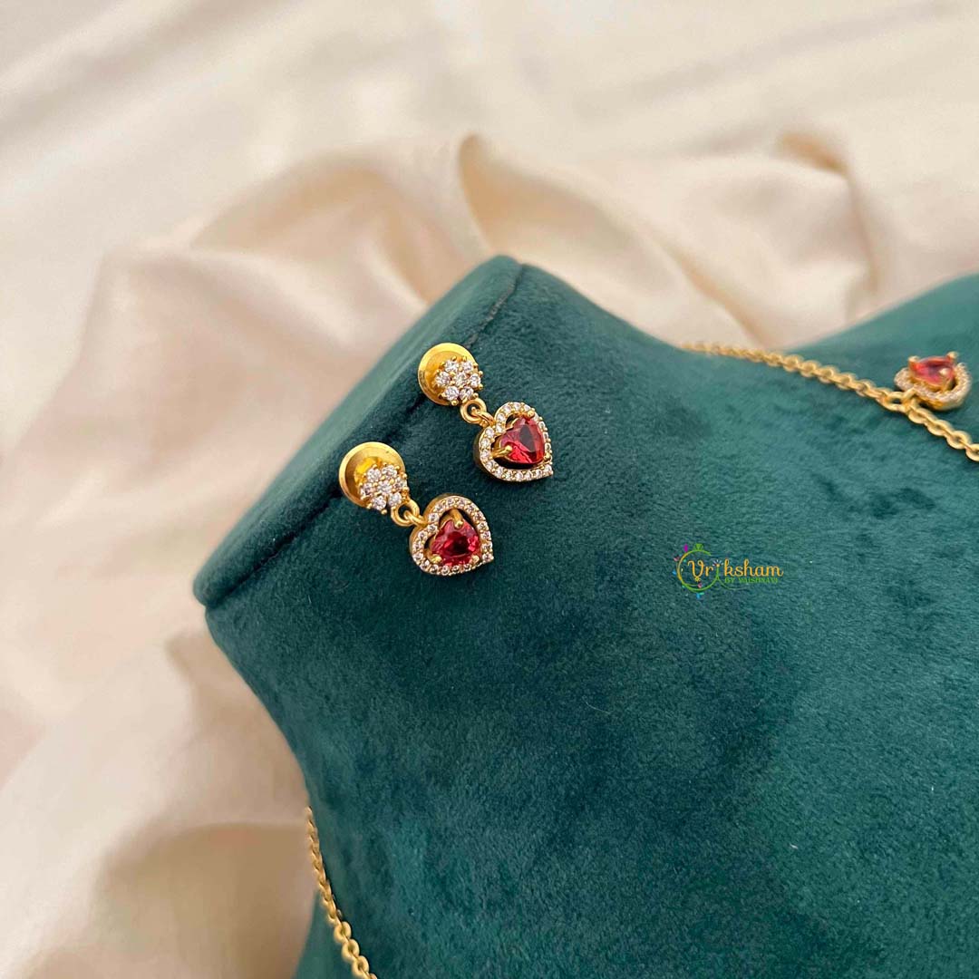 Elevate your jewelry collection with this exquisite ruby red heart necklace set. Featuring a striking heart-shaped pendant that captures light beautifully, paired with matching stud earrings for coordinated elegance. The delicate chain drapes gracefully, making it perfect for both everyday wear and special occasions. This timeless combination offers versatility—wear the pieces together for a cohesive look or separately to suit your mood. Crafted with attention to detail, this set brings a touch of refined sophistication to any ensemble.