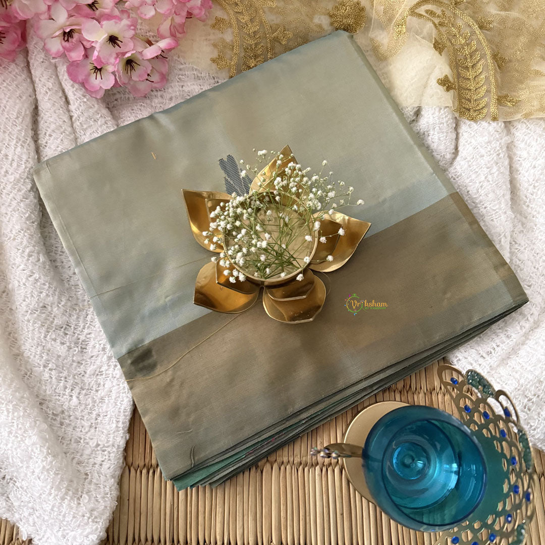 Vriksham Sage Green & Gold Chinnalampattu Saree Subtle Zari Accents Border-The Vriksham Sage Green & Gold Chinnalampattu Saree features a serene sage green base beautifully enhanced with subtle gold zari accents on the border. This exquisite combination offers understated elegance and timeless appeal, perfect for those who appreciate refined tradition with a soft, sophisticated touch. Its delicate shimmer and graceful drape make it ideal for special occasions demanding subtle luxury.Doesn't come with blouse -Saree only.