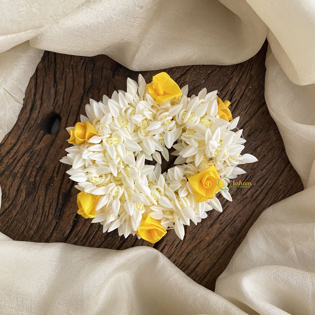 Enhance your bridal look with our Vriksham Scented Jasmine with Yellow Rose Hair Accessories. The delicate scents of jasmine and the feminine touch of yellow roses will elevate your ensemble and add a luxurious, exclusive feel to your wedding day. Complete your look with our Mallipoo Veni and feel like a work of art.