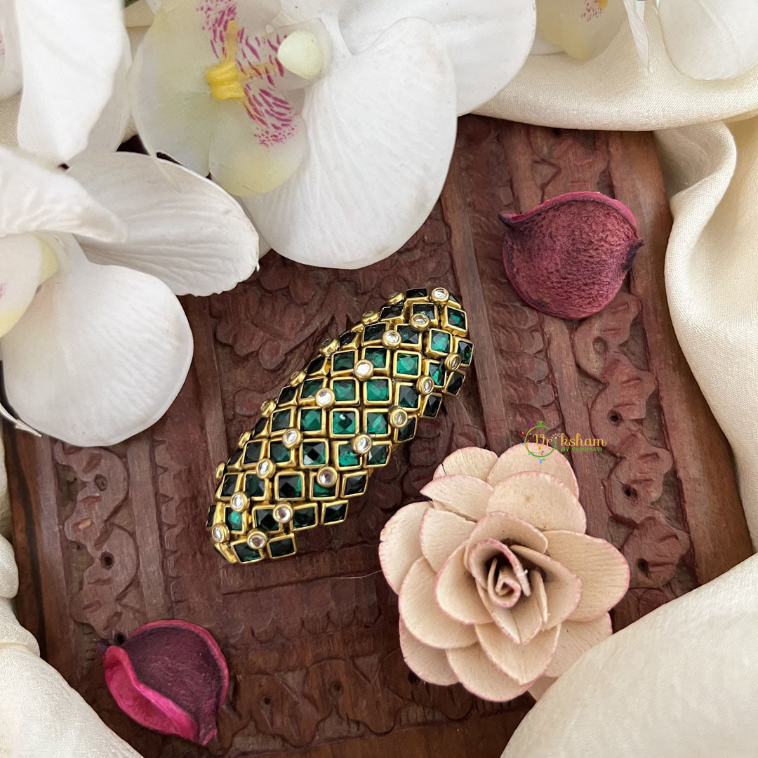 Add a touch of elegance and luxury to your sarees with the Vriksham Silk Thread Kundan Saree Pin in Green. This exquisite piece features intricately crafted silk threads and Kundan details, adding a sophisticated and exclusive touch to your look. Elevate your style with this timeless accessory.