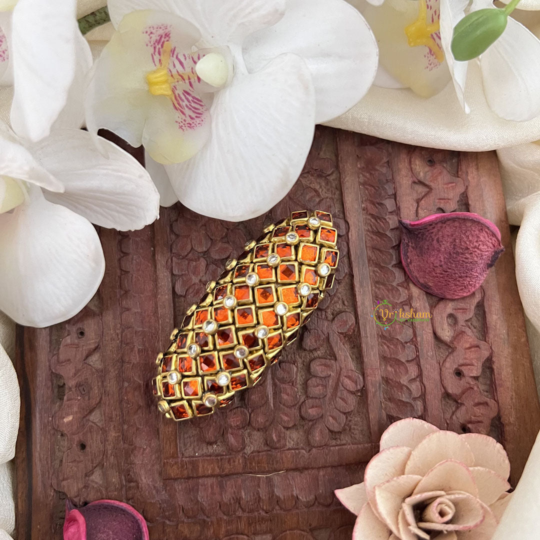 Add a touch of elegance and luxury to your sarees with the Vriksham Silk Thread Kundan Saree Pin in Orange. This exquisite piece features intricately crafted silk threads and Kundan details, adding a sophisticated and exclusive touch to your look. Elevate your style with this timeless accessory.