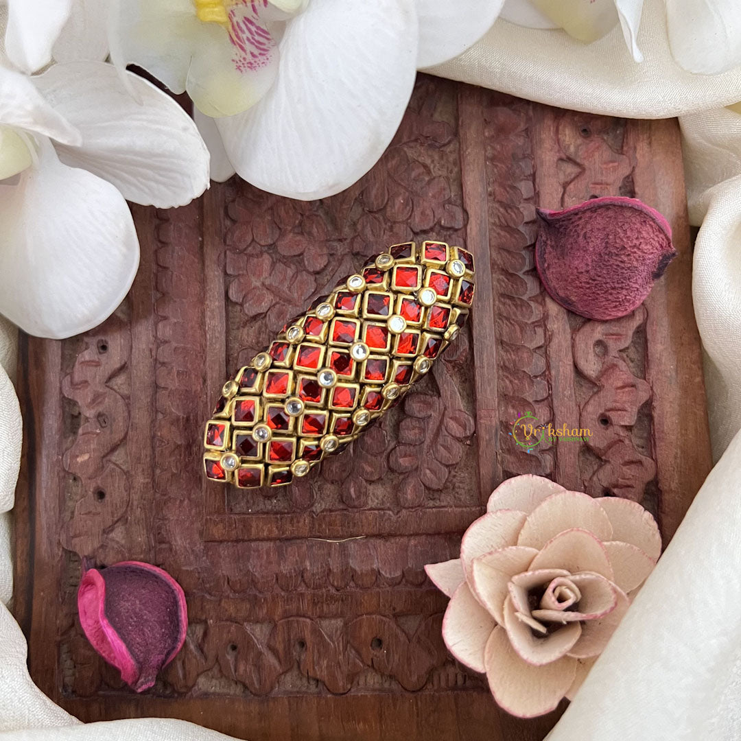 Add a touch of elegance and luxury to your sarees with the Vriksham Silk Thread Kundan Saree Pin in Red. This exquisite piece features intricately crafted silk threads and Kundan details, adding a sophisticated and exclusive touch to your look. Elevate your style with this timeless accessory.