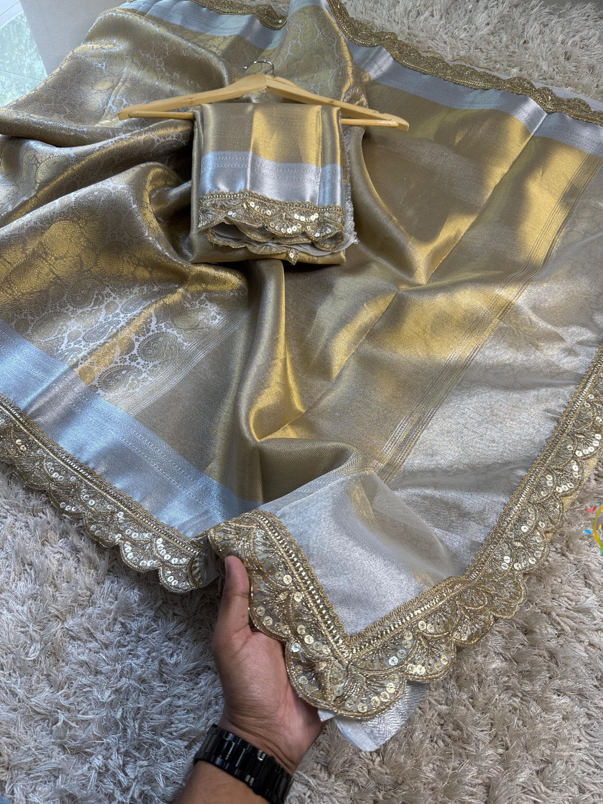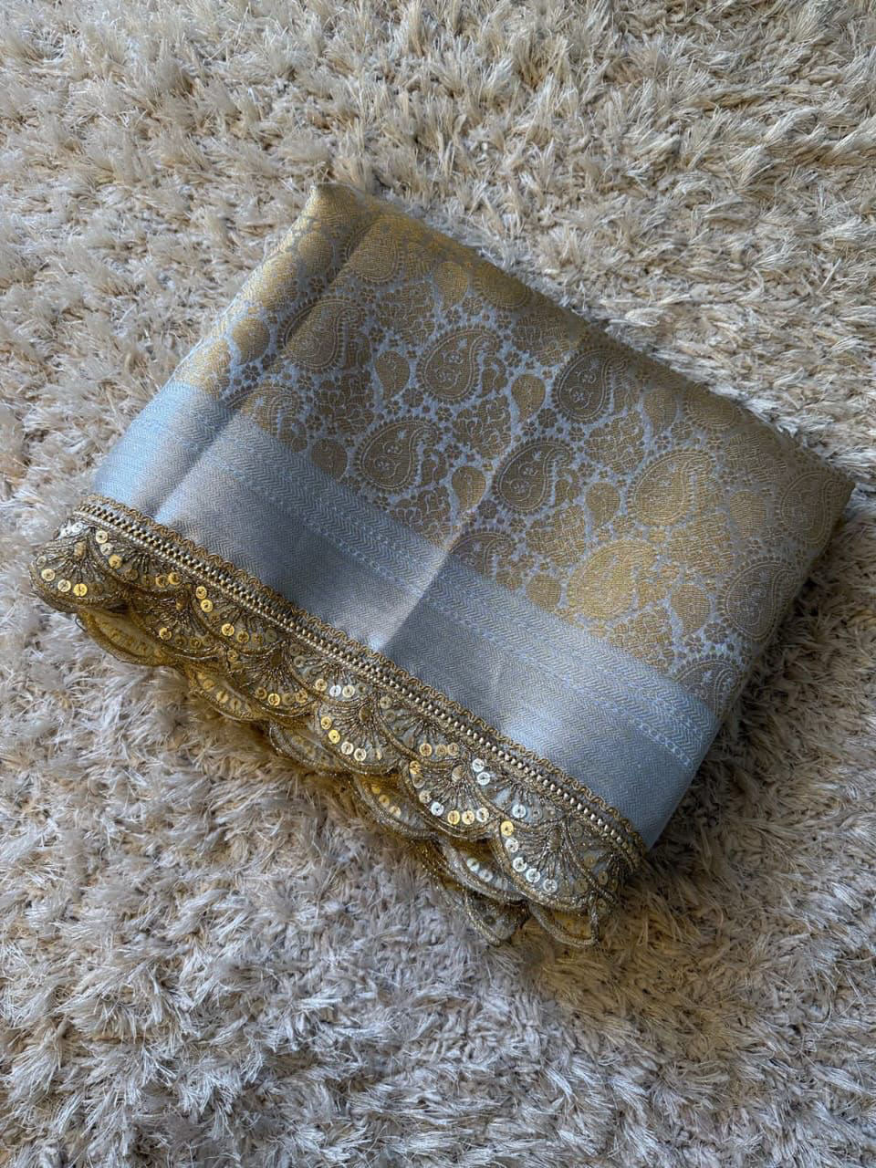 Discover the pinnacle of refined luxury with this Silver Katan Tanchoi Tissue Saree, a testament to exceptional craftsmanship. The ethereal silver palette evokes celestial elegance, while the sublime fusion of katan and tissue silk creates a textural masterpiece that drapes with incomparable grace. Intricate tanchoi patterns weave across the luminous surface with architectural precision, reflecting centuries of artisanal heritage. An investment piece of understated magnificence that transforms occasions into memorable celebrations with its timeless sophistication.