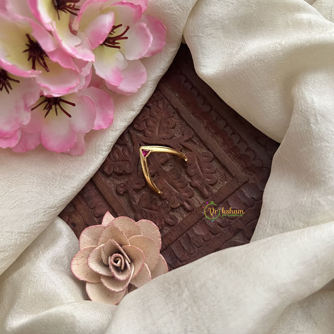 The Vriksham Simple Gold Look Alike Red Small Triangle Stone Vangi Finger Ring combines understated elegance with a modern geometric touch. Featuring a delicate red triangular stone set in a refined gold-look band, this ring offers a subtle statement of style and sophistication. Ideal for enhancing everyday wear or adding a graceful accent to special occasions.